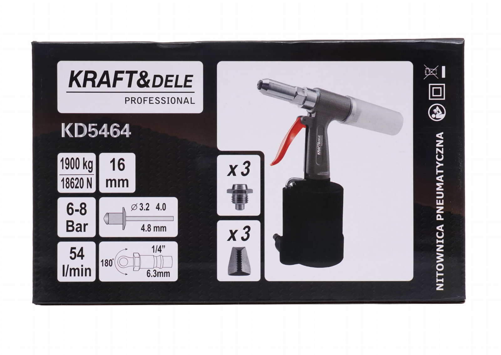 KD5464 DESCRIERE PRODUS Mașina de nituit pneumatică profesională Kraft&Dele modelul KD5464 este un tip de unealtă pneumatică disponibilă pentru îmbinarea a două sau mai multe bucăți de material folosind nituri oarbe.