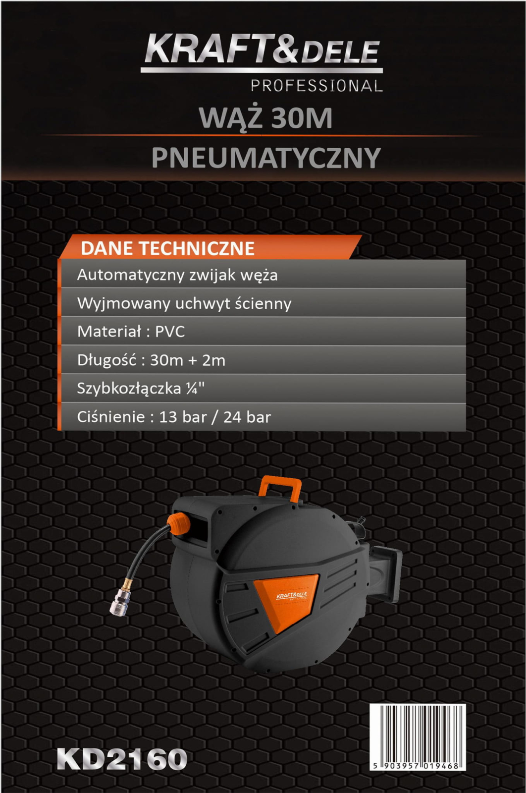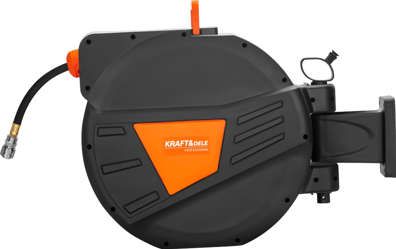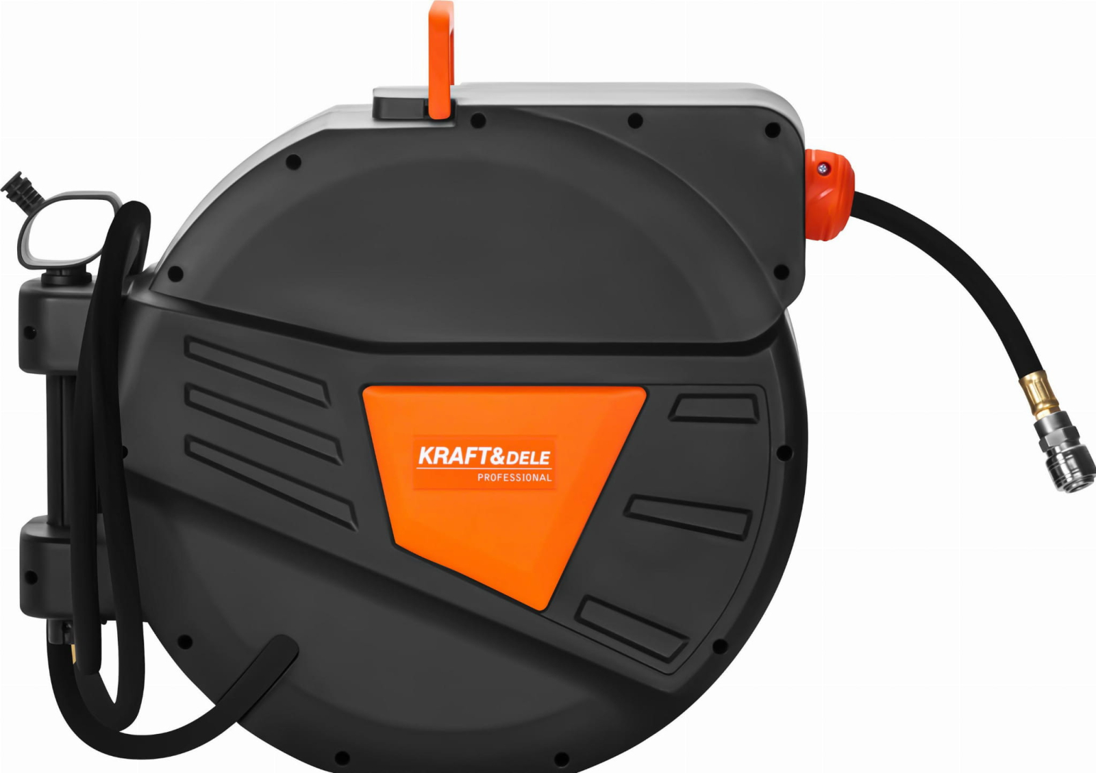 KD2160 este un furtun pneumatic practic de 30 m + 2 m de la KRAFT&DELE, montat pe o rolă automată, conceput pentru utilizare cu aer comprimat. Este un echipament esențial pentru orice atelier, centru de service, garaj sau unitate de producție unde ordinea, confortul și fiabilitatea sistemului pneumatic sunt esențiale. Tamburul este echipat cu un mecanism de blocare cu arc care oprește automat furtunul la lungimea selectată. Suportul pivotant la 180° permite montarea convenabilă pe perete sau tavan și permite funcționarea flexibilă în diverse direcții. Carcasa robustă din plastic și furtunul flexibil din PVC asigură durabilitate chiar și în condiții dificile de atelier. Sistemul automat de înfășurare a cablului protejează cablul de îndoiri și abraziune, prelungindu-i durata de viață și îmbunătățind siguranța în muncă. Sistemul de înfășurare ajută la menținerea ordinii la locul de muncă prin eliminarea cablurilor încurcate și reducerea riscului de împiedicare.