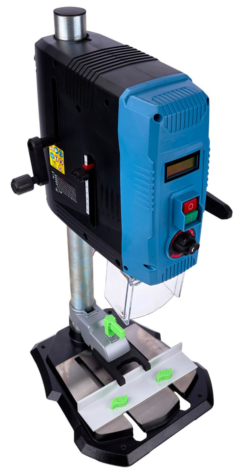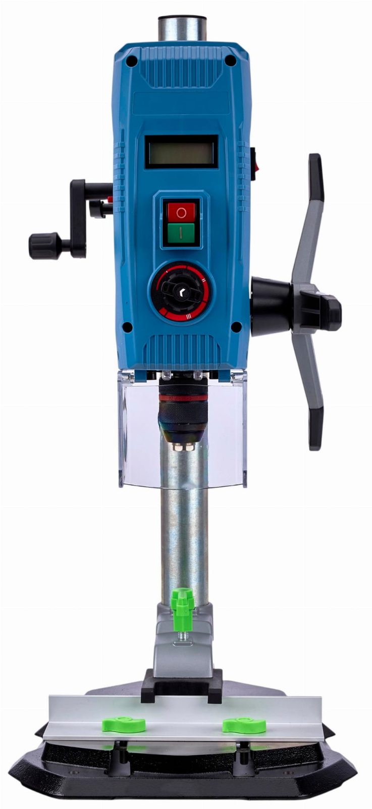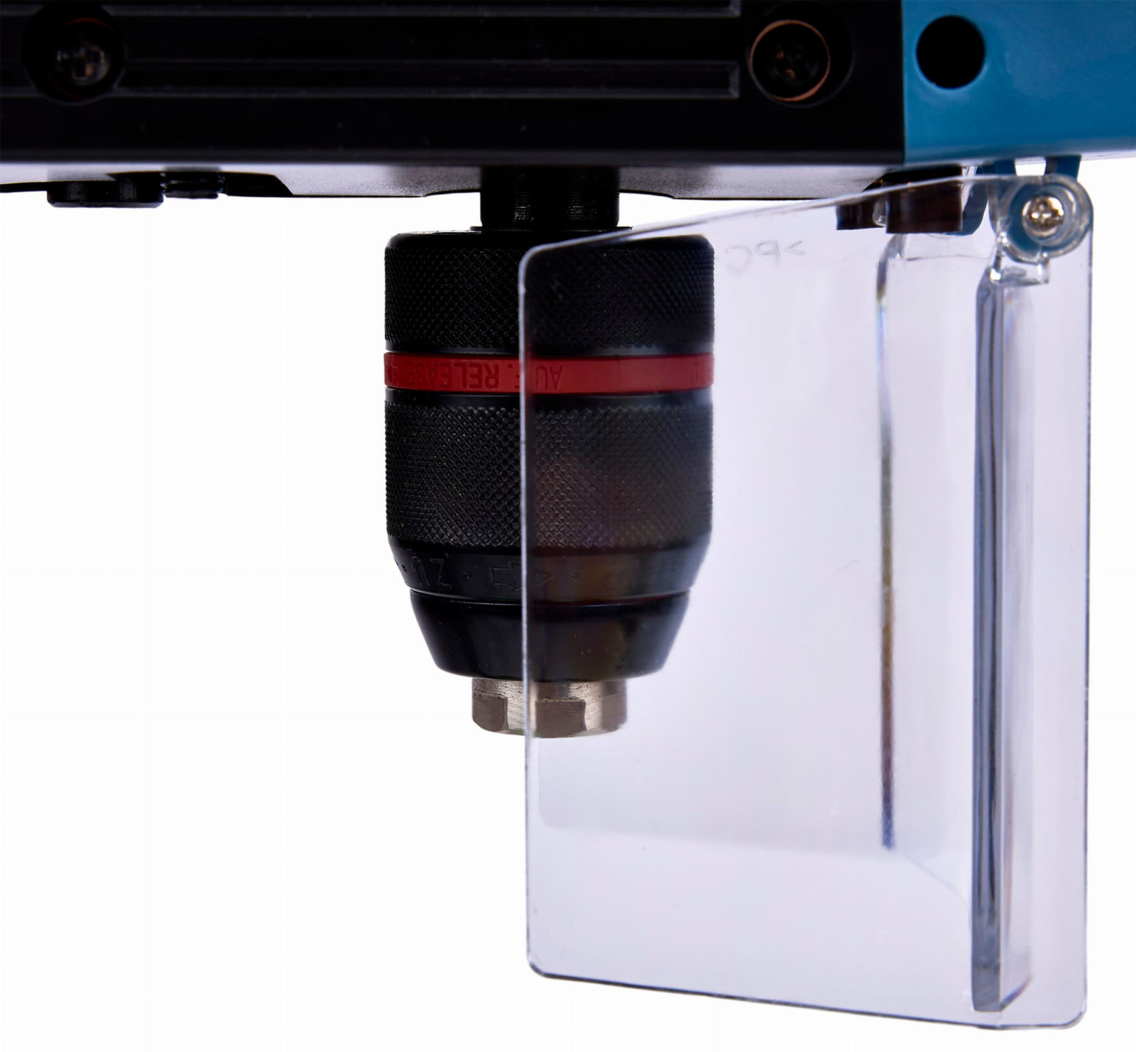 Laser Dispozitivul dispune de un laser de precizie încorporat, alimentat de la rețea (nu necesită baterii). Utilizarea laserului facilitează semnificativ găurirea precisă. Laser cu linii în cruce cu fascicul dublu. Afișaj LCD Mașina de găurit este echipată cu un ecran LCD iluminat din spate care afișează informații despre viteză și adâncimea de găurire. Panou de control Butoanele panoului de control vă permit să reglați viteza de rotație, să verificați penetrarea burghiului în material, să setați punctul zero, să porniți simultan laserul, iluminarea de fundal și laserul cu iluminare de fundal. iluminare cu LED-uri Pe lângă mandrina burghiului, burghiul este echipat cu iluminare LED pentru a îmbunătăți confortul în lucru. Mandrină de găurit puternică și masivă, cu autoblocare Date tehnice