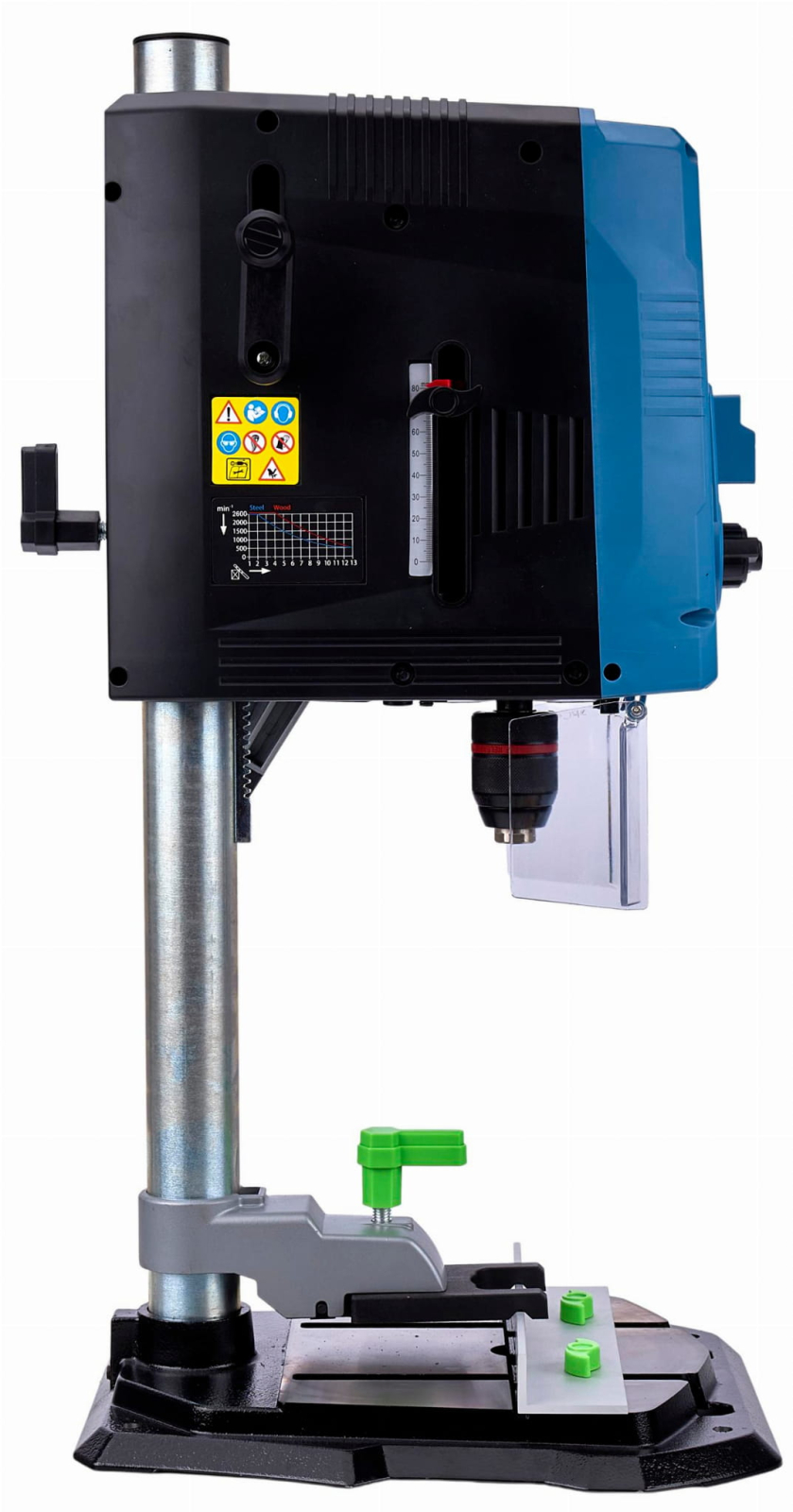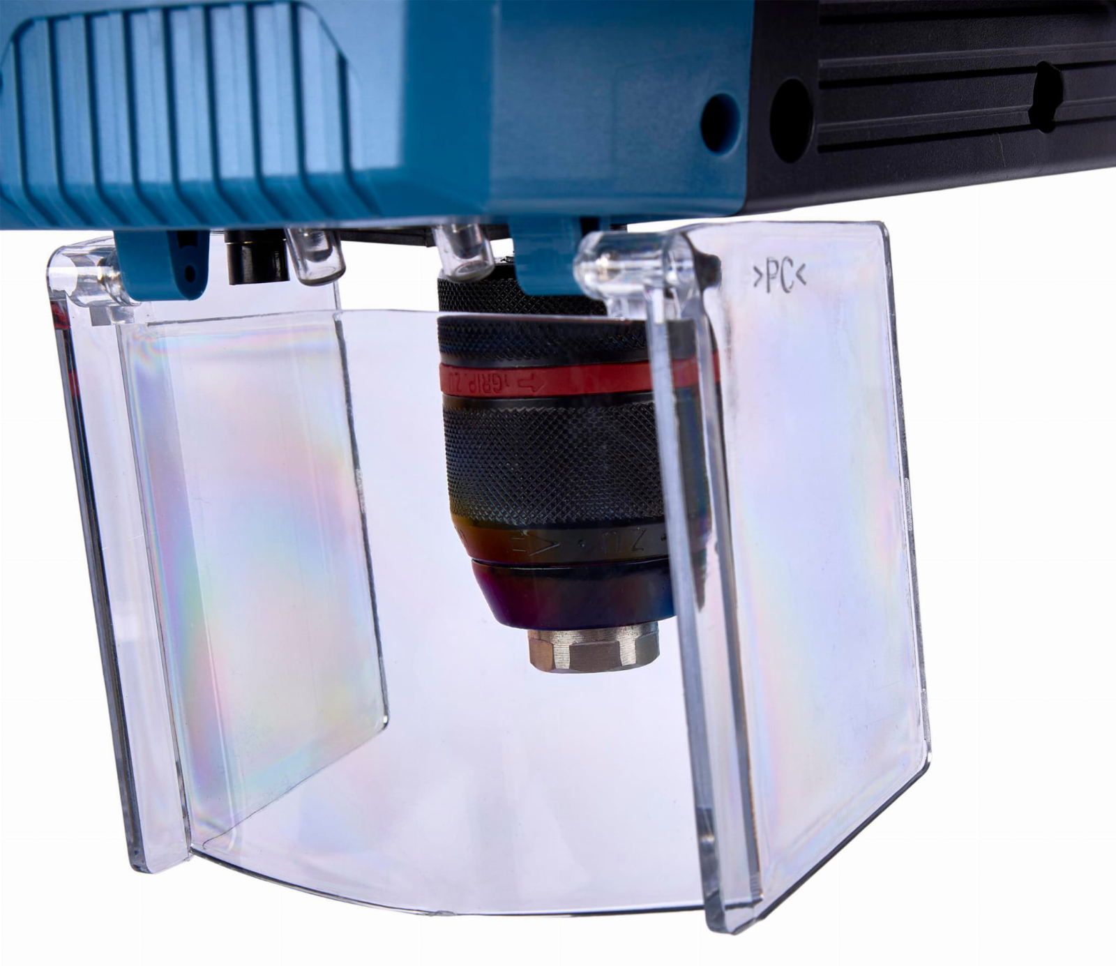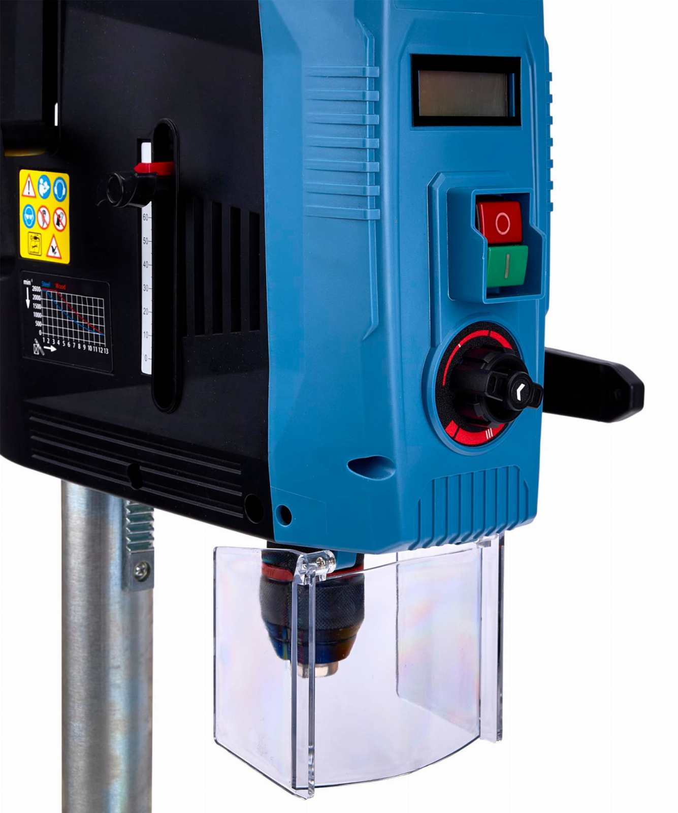 Laser Dispozitivul dispune de un laser de precizie încorporat, alimentat de la rețea (nu necesită baterii). Utilizarea laserului facilitează semnificativ găurirea precisă. Laser cu linii în cruce cu fascicul dublu. Afișaj LCD Mașina de găurit este echipată cu un ecran LCD iluminat din spate care afișează informații despre viteză și adâncimea de găurire. Panou de control Butoanele panoului de control vă permit să reglați viteza de rotație, să verificați penetrarea burghiului în material, să setați punctul zero, să porniți simultan laserul, iluminarea de fundal și laserul cu iluminare de fundal. iluminare cu LED-uri Pe lângă mandrina burghiului, burghiul este echipat cu iluminare LED pentru a îmbunătăți confortul în lucru. Mandrină de găurit puternică și masivă, cu autoblocare Date tehnice