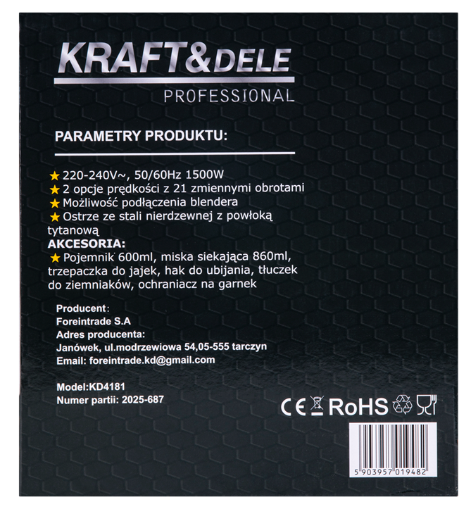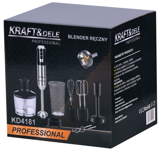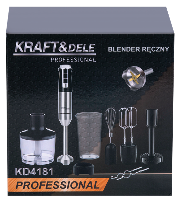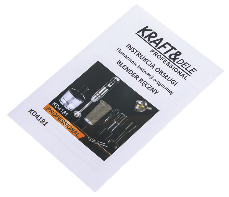COMPOZIȚIA PRODUSULUI: ✅ Blender de mână KD4181 ✅ Lamă de blender ✅ Pahar de 600 ml ✅ Bol de tocat 860 ml ✅ Teluri și cârlige ✅ Pasator de cartofi ✅ Capac pentru bol ✅ Manual de utilizare în poloneză ✅ Ambalaj original ✅ Garanție