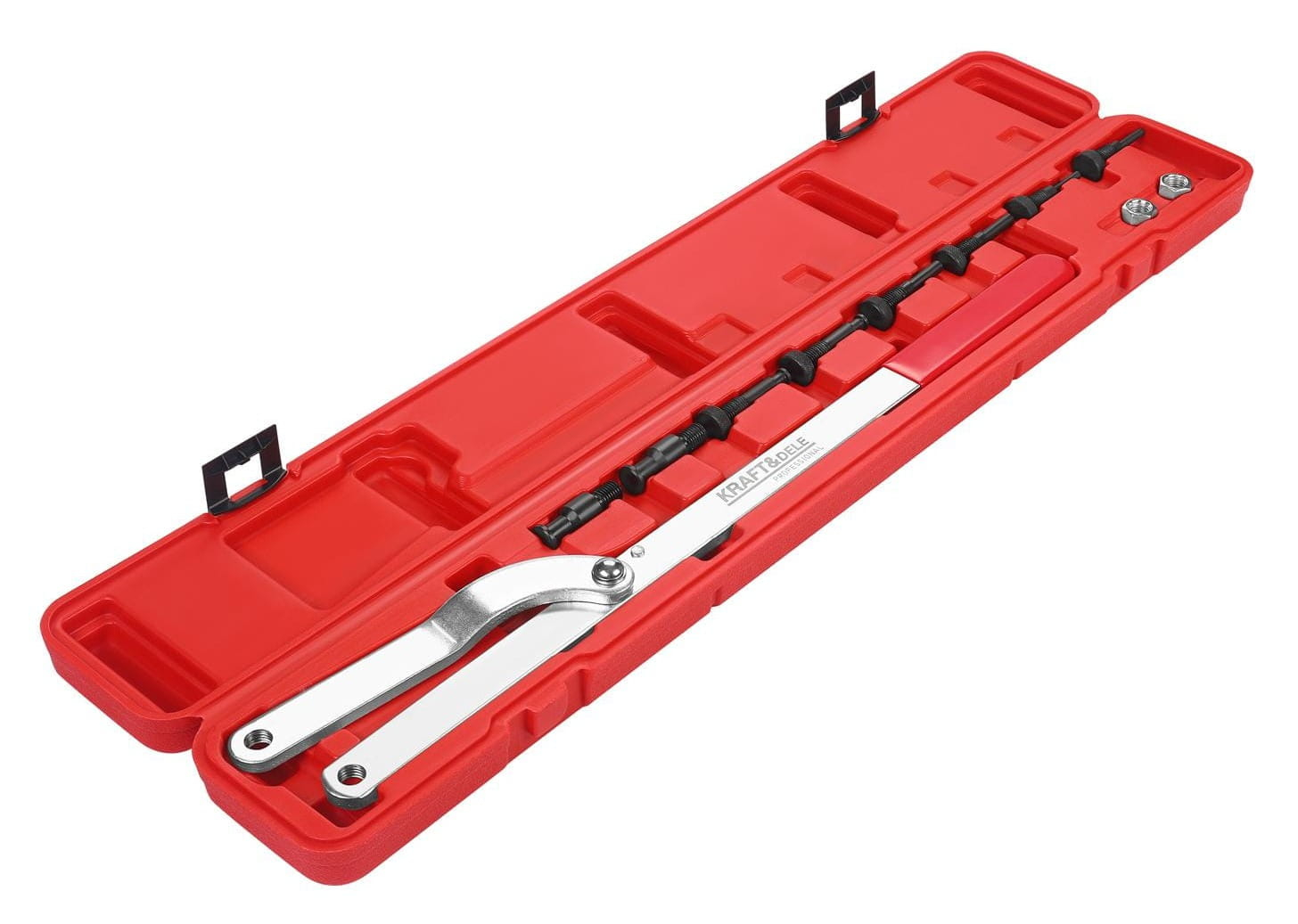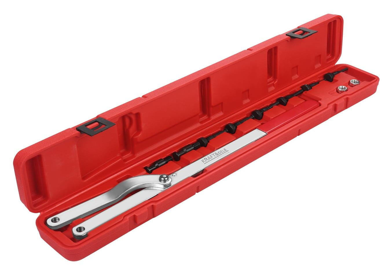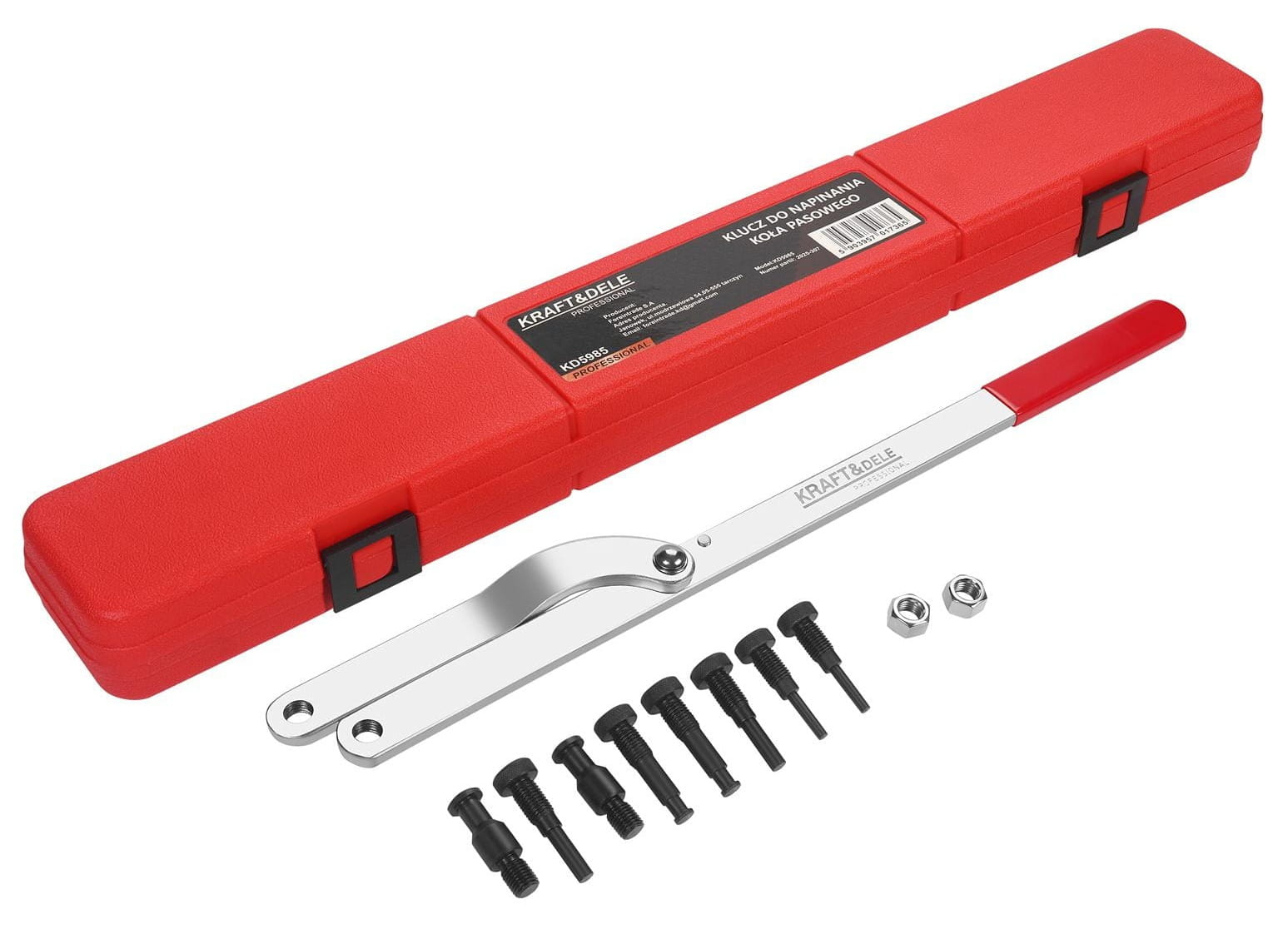 CHEIE DE TENSIONARE A ROLETEI KD5985 KD5985 este o cheie profesională pentru tensionarea scripetelor, concepută pentru utilizare universală în atelierele auto. Cu un mâner reglabil de 53 cm și o gamă largă de operare de 40–220 mm, cheia se potrivește majorității modelelor de vehicule disponibile pe piață. Echipată cu știfturi conice înlocuibile și o construcție robustă, cheia asigură o prindere sigură și o fixare precisă. Întreaga unitate este ambalată într-o cutie practică din plastic pentru depozitare și transport ușor.