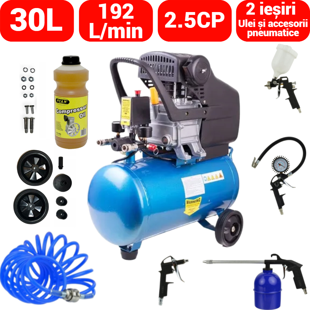 Compresorul de ulei cu o capacitate a rezervorului de 30 de litri este un dispozitiv conceput pentru a gestiona numeroase sarcini legate de aerul comprimat, atât în atelierul de acasă, cât și în aplicații semiprofesionale.