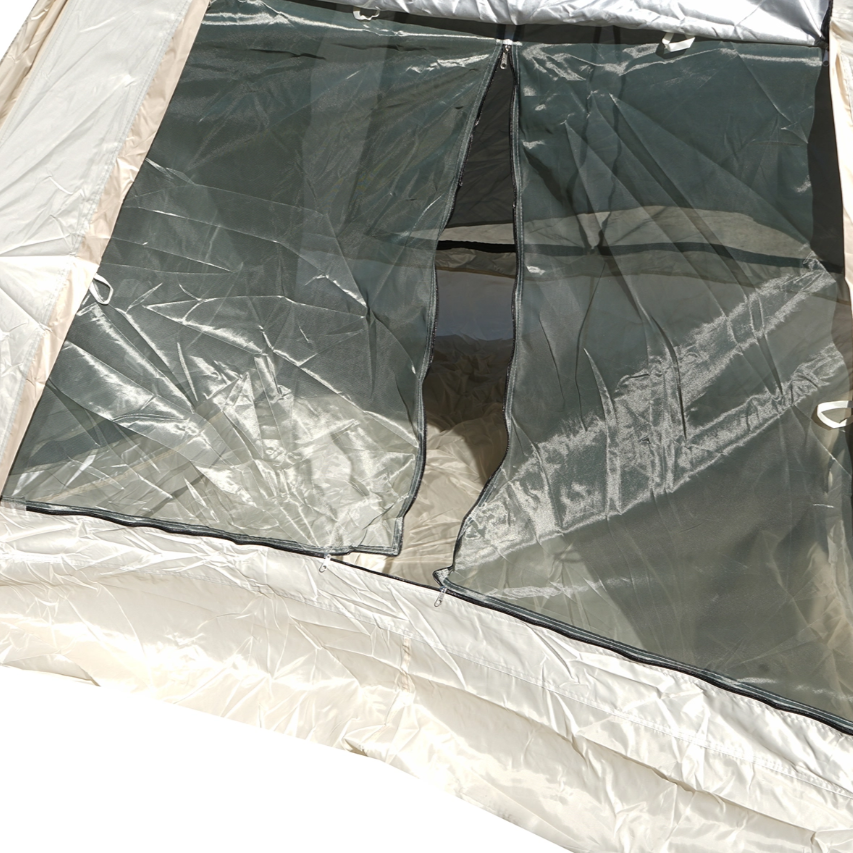 Construit din materiale rezistente, cu protectie UV si strat impermeabil, cortul ofera confort si siguranta in orice conditii meteo. Cele doua intrari si deschiderea pe 4 parti cu plasa anti-insecte integrata asigura protectie si o ventilatie excelenta pentru confort si relaxare.
