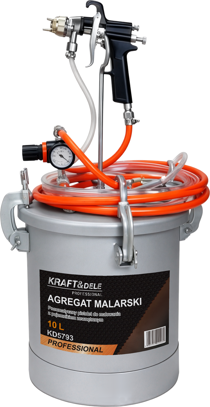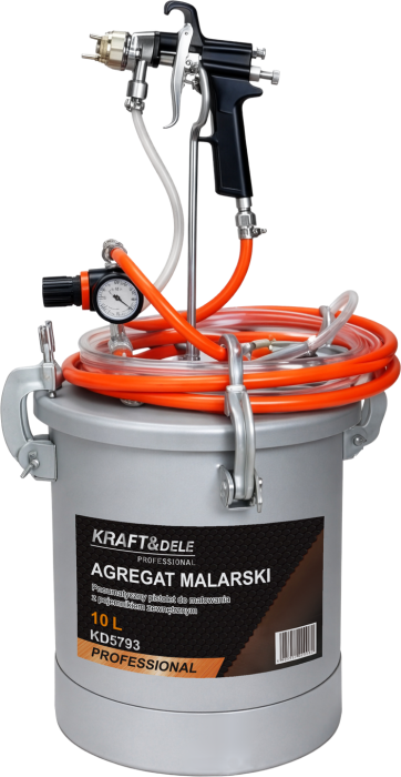 KD5793 este o unitate pneumatică profesională de vopsire de la KRAFT&DELE, concepută pentru aplicarea precisă și rapidă a vopselelor, lacurilor, adezivilor, emulsiilor, baițurilor, vopselelor anticorozive și tapetului pulverizat. Datorită sistemului său eficient de pulverizare, dispozitivul permite acoperirea eficientă a suprafețelor mari, reducând în același timp consumul de material. Modelul KD5793 dispune de un rezervor de presiune din oțel, de 10 litri, cu rezistență sporită la coroziune. Un regulator de aer bidirecțional permite reglarea precisă a presiunii în interiorul rezervorului, rezultând o pulverizare uniformă și controlată. Un pistol de pulverizare ergonomic cu o duză de 2,0 mm asigură un finisaj îngrijit, în timp ce un set de furtun de 2,9 m (pentru vopsea și aer) asigură libertatea de mișcare în timpul lucrului.