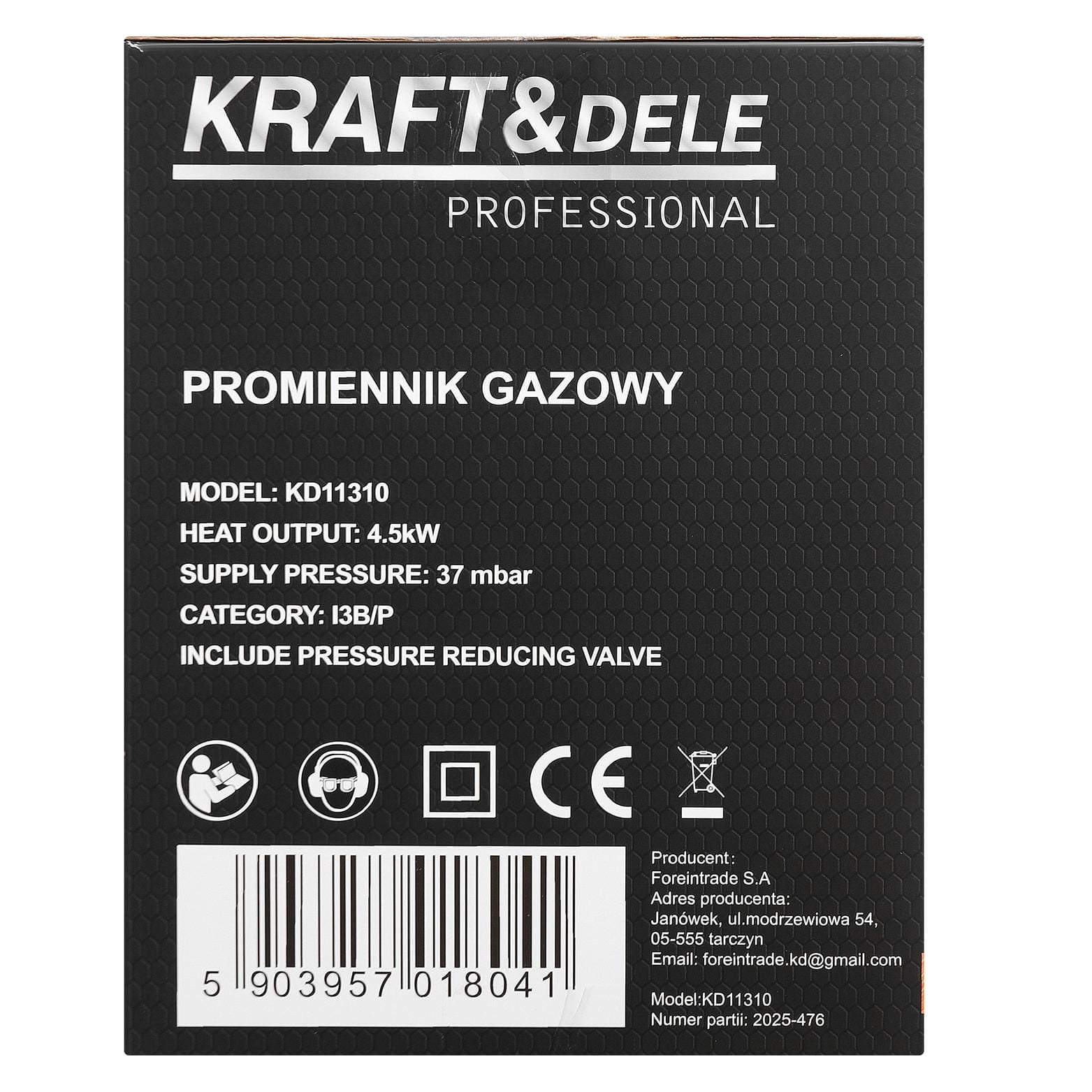Încălzitor pe gaz KD11310 KD11310 este un încălzitor pe gaz puternic de 4,5 kW, conceput pentru utilizatorii care necesită încălzire rapidă și eficientă în orice mediu. Este perfect pentru ateliere și garaje bine ventilate, precum și pentru terase și șantiere de construcții. Datorită suportului solid, suprafeței mari de încălzire și materialelor de înaltă calitate, încălzitorul asigură o încălzire rapidă și o durată lungă de viață, în timp ce supapa de reducere a presiunii și furtunul lung al cilindrului asigură o utilizare sigură și confortabilă.