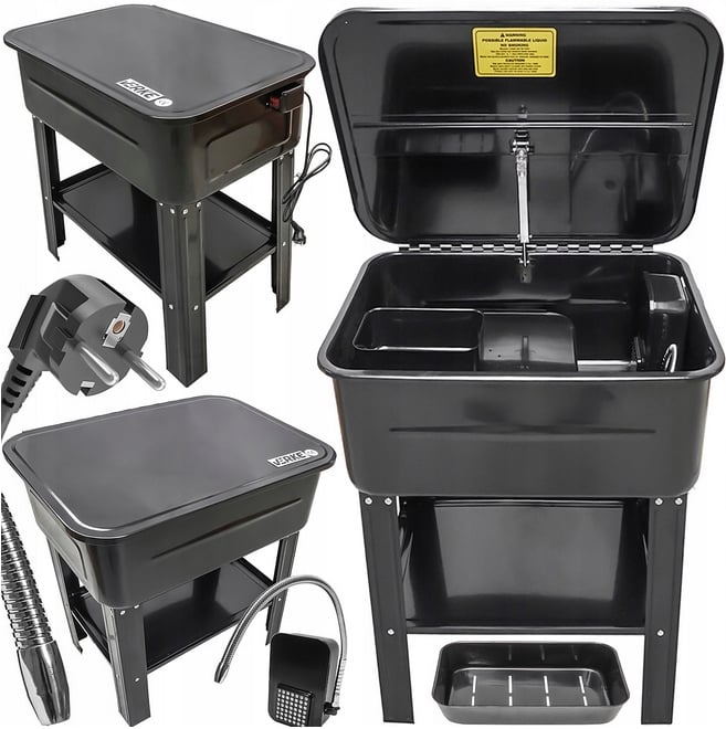 Această unealtă este un accesoriu esențial pentru orice atelier sau service de anvelope. Pompa extrage fluidul de jos (într-un circuit închis) și îl alimentează mai departe sub presiune printr-un furtun flexibil. Prin urmare, fie că este vorba de grăsime, reziduuri de ulei, depuneri de carbon sau chiar reziduuri de prelucrare a materialelor, puteți îndepărta cu ușurință toți contaminanții. Curățarea eficientă va asigura îndepărtarea rapidă a tuturor reziduurilor de murdărie de pe suprafețele uneltelor sau pieselor, de exemplu, mașini/mașini. Mașina de spălat este echipată cu o cuvă de 76 de litri, permițându-vă să introduceți cu ușurință o duzină de unelte simultan. În plus, dispozitivul are un capac automat, un raft cu sita și un recipient mic. DATE TEHNICE: