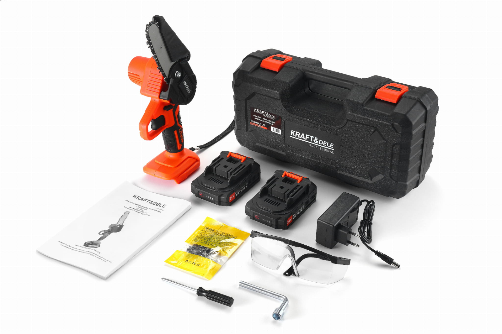COMPOZIȚIA SETULUI: FIERĂSTRĂU CU BRAȚ FĂRĂ ACUMULATOR 4" KD1064 2 baterii de 21V Cheie, șurubelniță Încărcător Instrucțiuni în poloneză Chitanță sau factură Ambalajul original