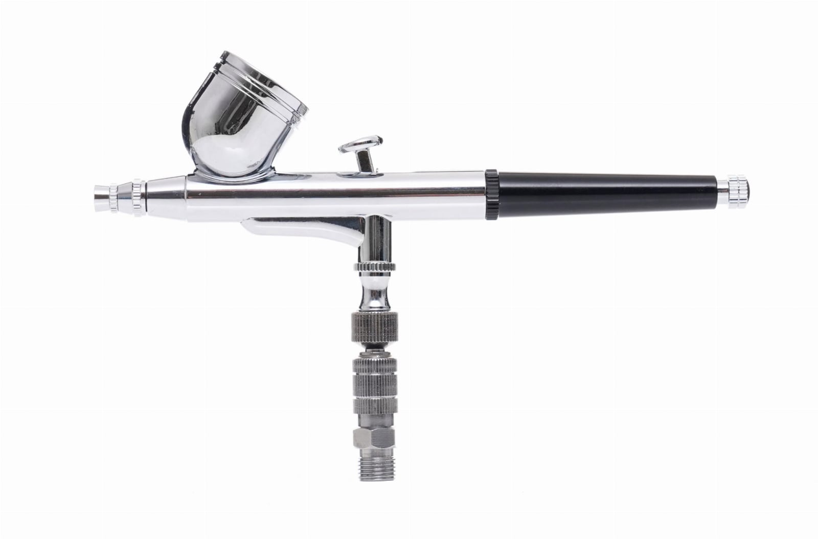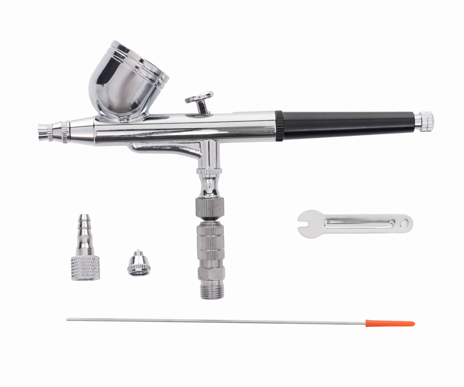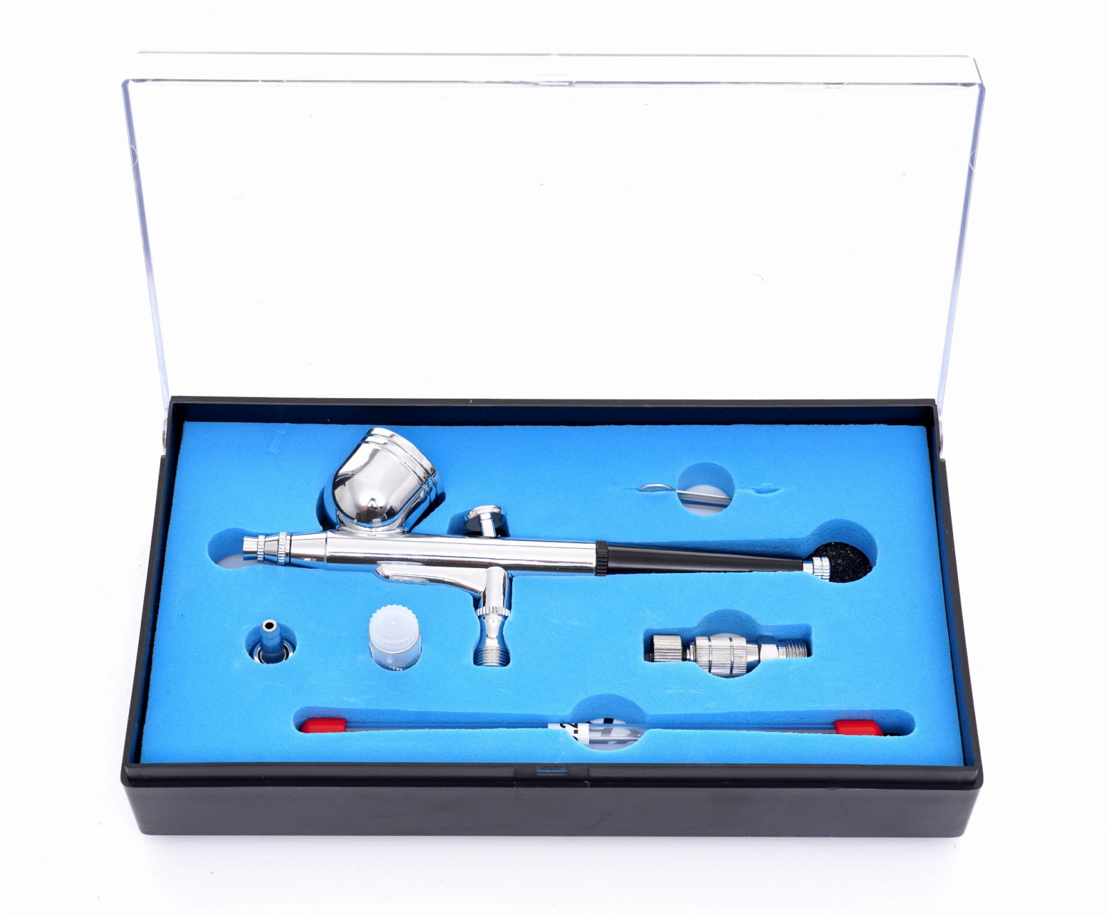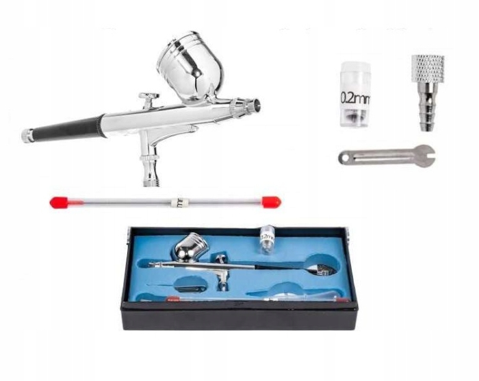 Setul este fabricat din materiale de înaltă calitate, cu o atenție meticuloasă la detalii. Pistolul de pulverizare dispune de un debit de vopsea reglabil, setat cu ajutorul unui șurub de reglare de la capătul mânerului. Duzele interschimbabile vă permit să alegeți forma și lățimea jetului de vopsea, estompând sau accentuând elementele pictate, în funcție de sarcina de lucru.