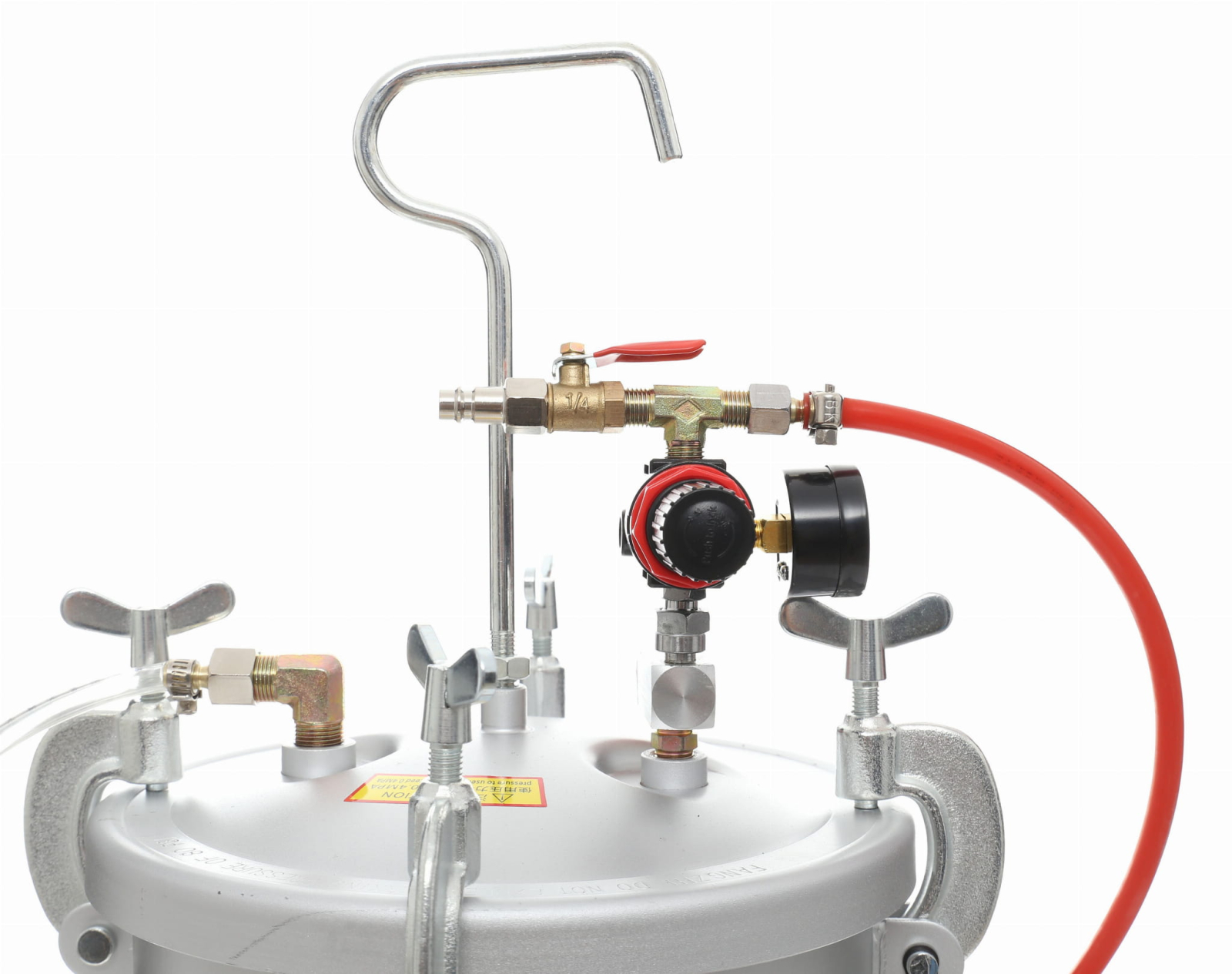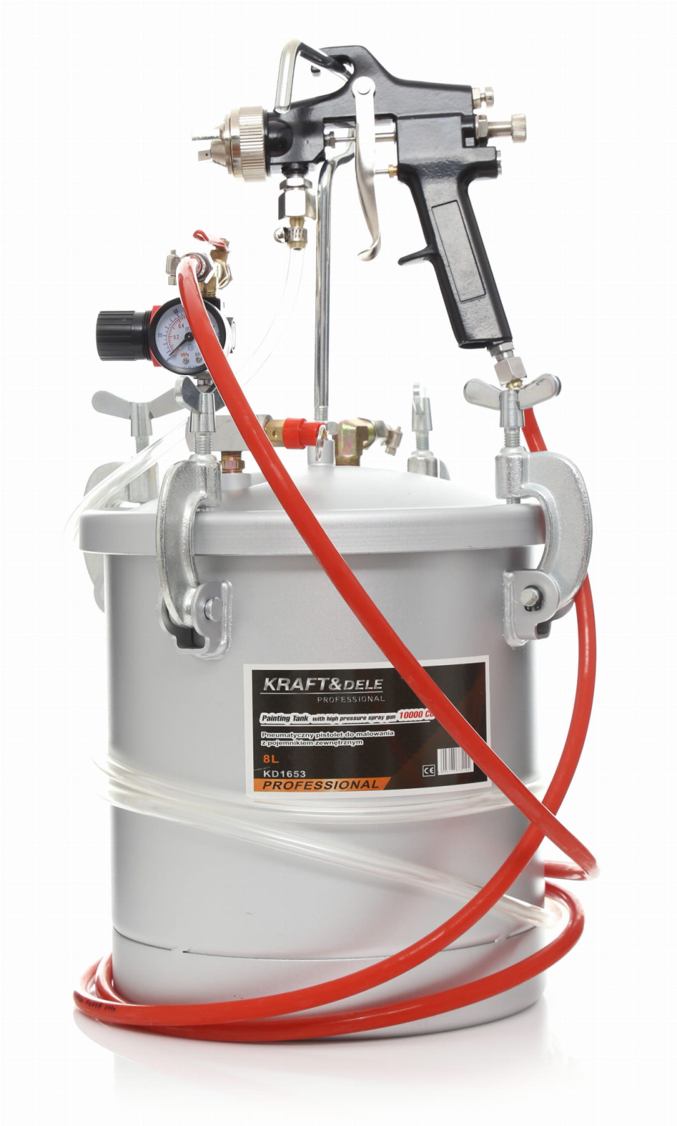 Setul include un rezervor de aluminiu de 8 litri cu reductor de presiune, manometru și supapă de siguranță montate pe capac. Vopseaua este alimentată sub presiune către pistolul de vopsit și apoi pulverizată cu aer comprimat. Acest pulverizator de vopsea sub presiune este ideal pentru vopsirea suprafețelor mari și nu numai.