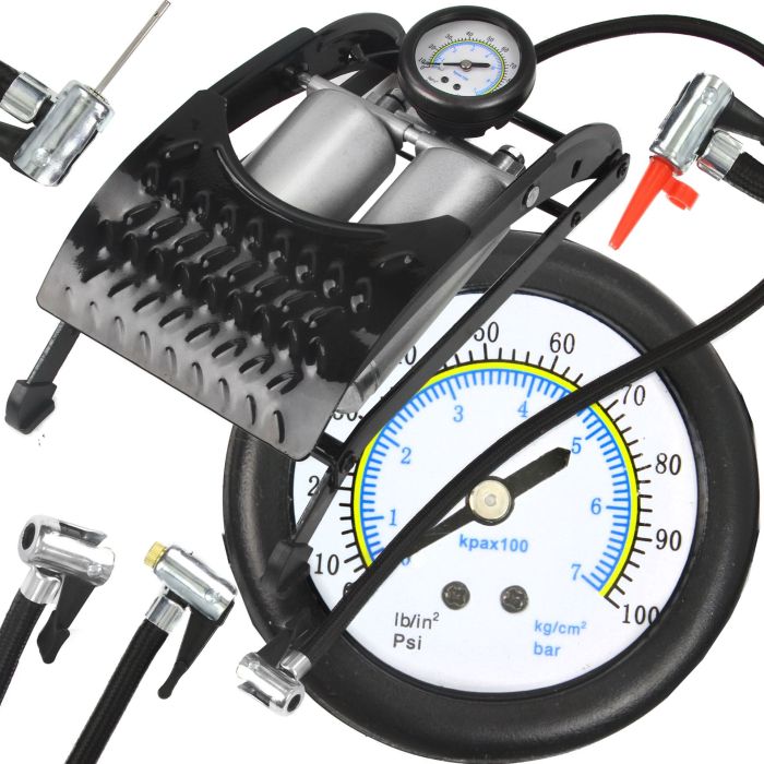POMPĂ DE PICIOR PENTRU AUTO, CU DOUĂ PISTOANE, BICICLETĂ, 7 BAR, MANOMETRU INCLUS CU ȘURUȚE DE UMFLARE