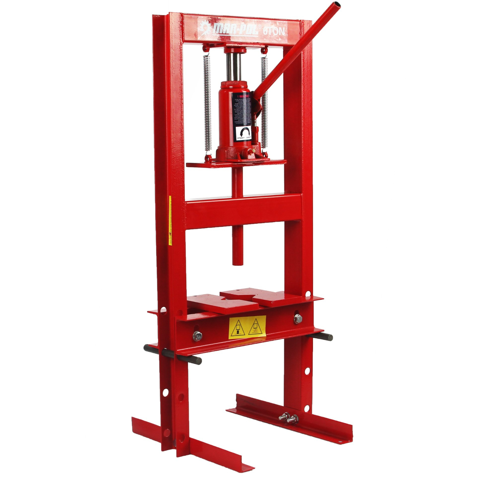 PRESĂ HIDRAULICĂ CU O PRESIUNE DE 6 TONE Fabricată din oțel, echipată cu un raft de lucru transversal cu reglare pe 4 niveluri. Acest dispozitiv este destinat pentru îndreptare, îndoire, comprimare, presare, împingere etc. Construcție din oțel. Raft de lucru reglabil transversal. Echipat cu un set de decupaje. DATE TEHNICE:
