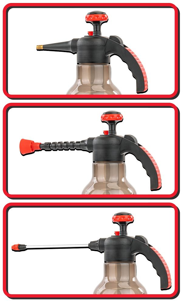 Pulverizatorul este echipat cu o pompă manuală încorporată care vă permite să creșteți rapid presiunea de lucru în interiorul rezervorului. Această soluție elimină necesitatea unei surse de alimentare externe, asigurând mobilitate completă și disponibilitate pentru utilizare oriunde. Mânerul ergonomic asigură o pompare confortabilă și eficientă, chiar și în timpul utilizării prelungite.