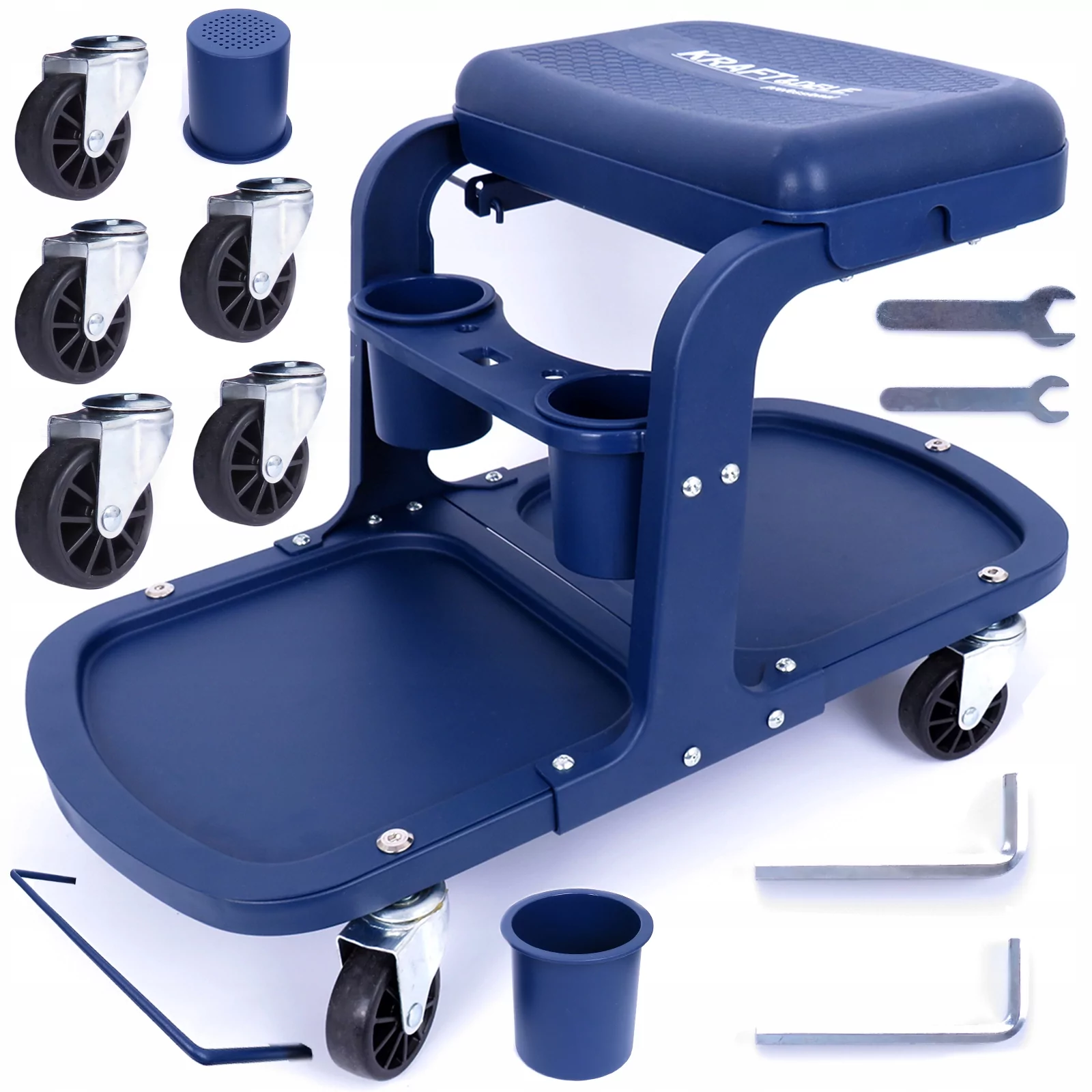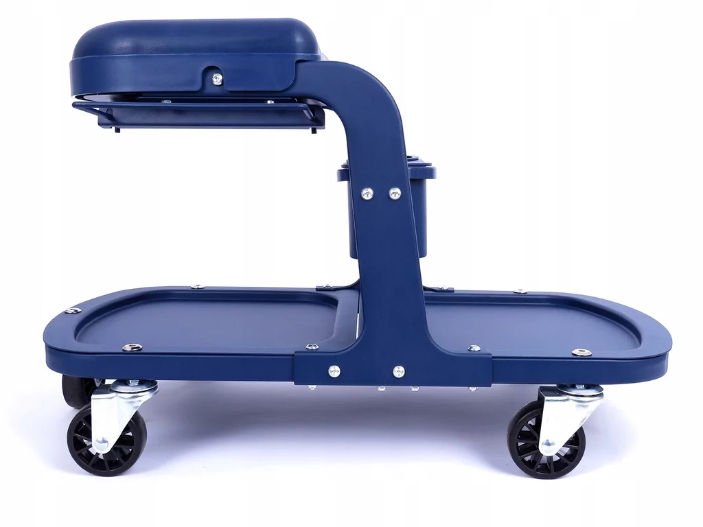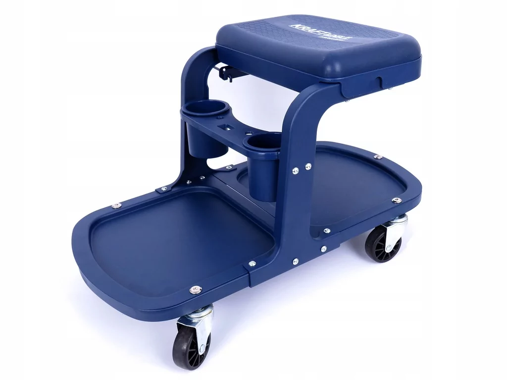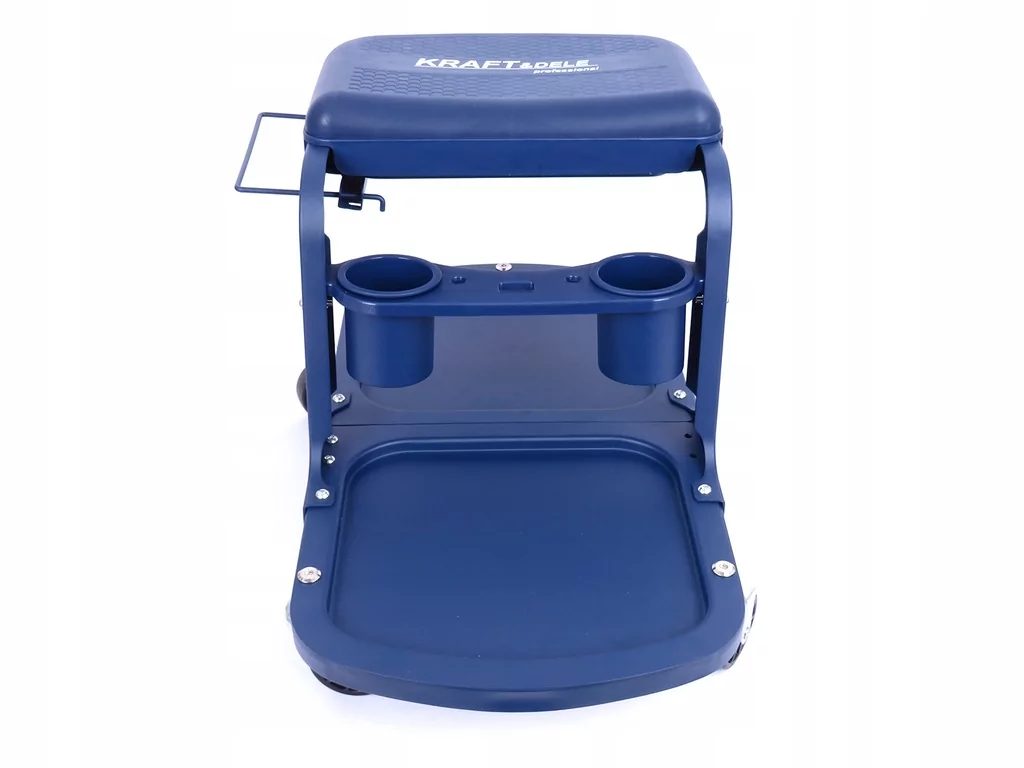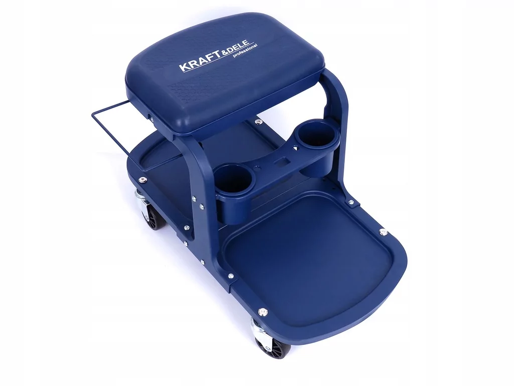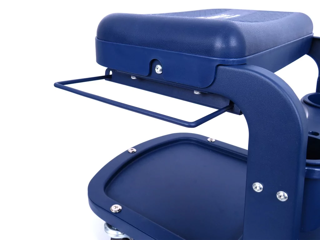 Un scaun cu roți oferă confort în timpul lucrului în atelier. Mânerul practic din partea dreaptă poate fi folosit pentru prosoape, unelte etc. Sub scaun sunt montate două recipiente.