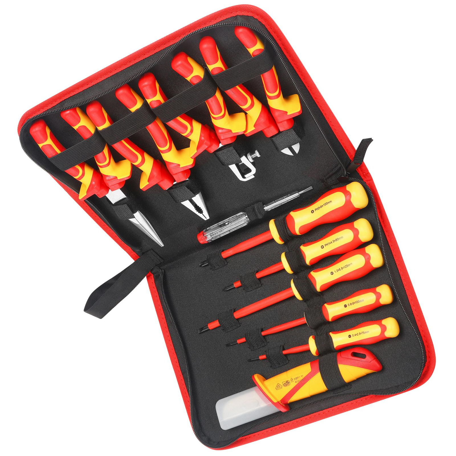 ✅ COMPOZIȚIA PRODUSULUI: ✅ Clește cu vârf plat izolat – 200 mm ✅ Clește izolat – 180 mm ✅ Cuțite laterale izolate – 160 mm ✅ Clește dezizolator pentru fire izolate – 160 mm ✅ Cuțit drept izolat pentru cablu – 180 mm ✅ Șurubelniță plată izolată – 0,4×2,5×75 mm ✅ Șurubelniță plată izolată – 0,6×3×100 mm ✅ Șurubelniță plată izolată – 1×5,5×125 mm ✅ Șurubelniță cu cap în cruce izolată – PH 1×4,5×80 mm ✅ Șurubelniță Phillips izolată – PH 2×6×100 mm ✅ Tester de tensiune – 3,0×140 mm ✅ Carcasă ✅ Garanție