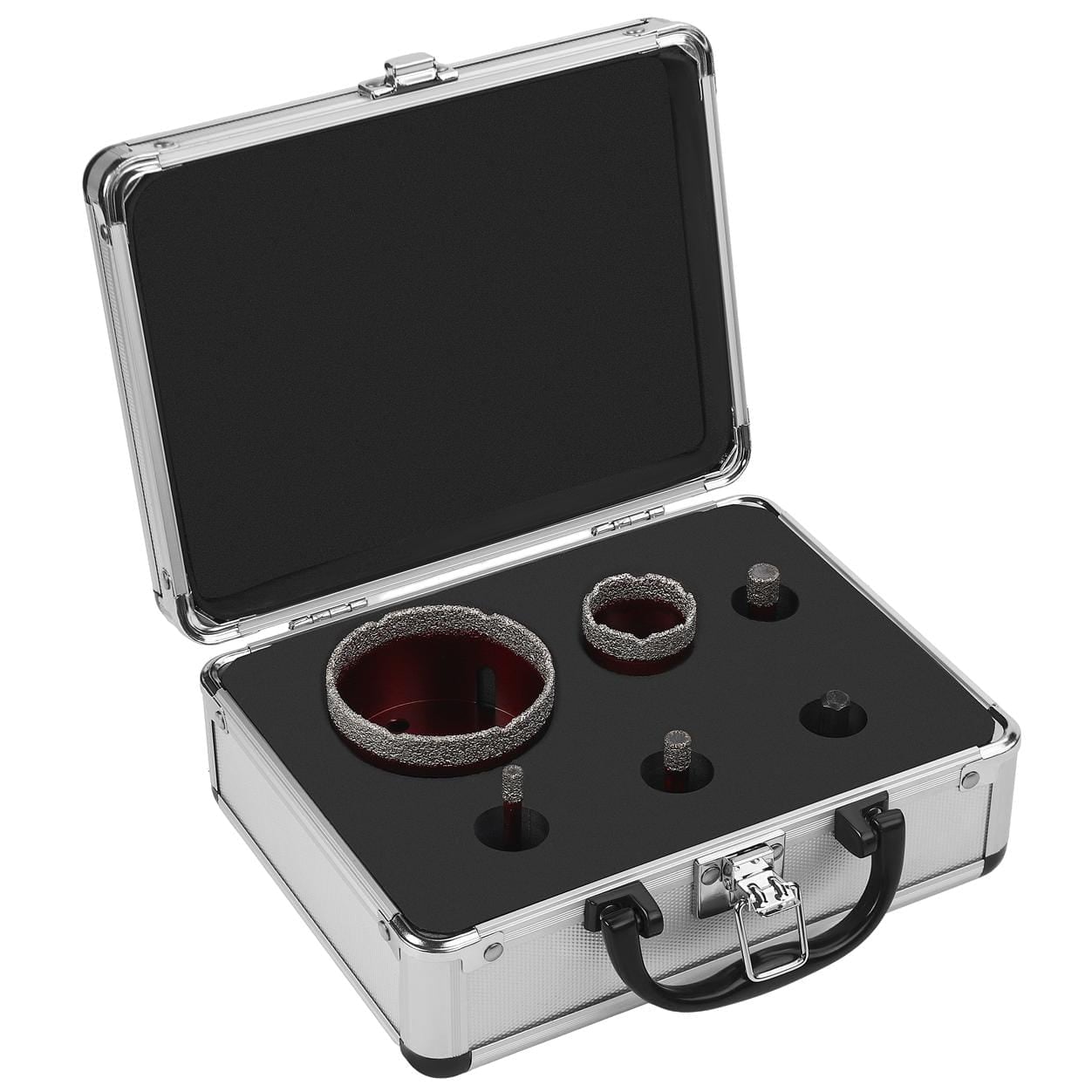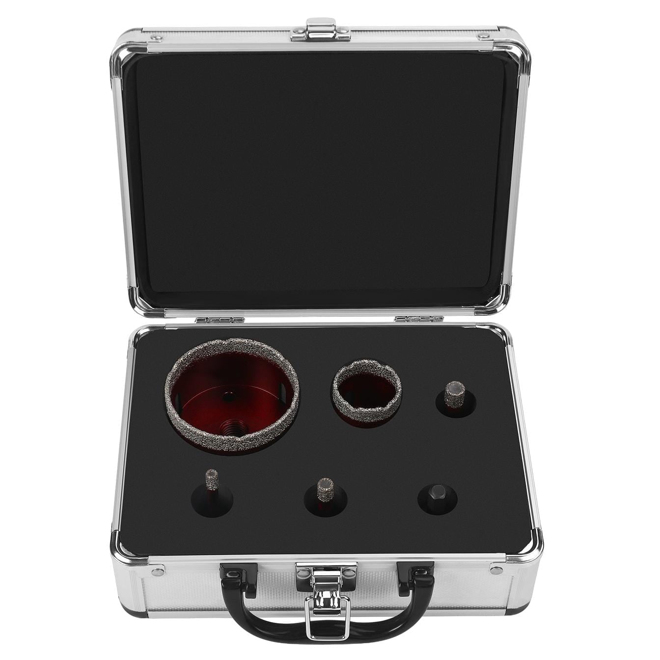 COMPOZIȚIA PRODUSULUI: ✅ Ferăstrău circular diamantat cu carotă de 6 mm ✅ Ferăstrău circular diamantat cu carotă de 8 mm ✅ Fierăstrău circular cu carotă diamantată 10 mm ✅ Ferăstrău circular diamantat de 35 mm ✅ Fierăstrău circular cu carotă diamantată 68 mm ✅ Adaptor ✅ Valiză solidă cu mâner și cataramă de fixare ✅ Garanție
