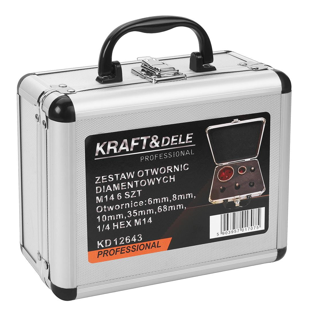 SET DE CAROTE CU DIAMANT KD12643 Setul de carote diamantate KRAFT&DELE KD12643 este un set complet de unelte pentru găurire precisă în materiale dure, cum ar fi ceramica, gresia și piatra. Diversele diametre ale carotelor și adaptoarele incluse fac munca rapidă, precisă și convenabilă. Componentele setului sunt ambalate cu grijă într-o cutie robustă, cu mâner de transport și cataramă cu încuietoare, facilitând organizarea uneltelor și depozitarea lor în siguranță. CARACTERISTICI ALE PRODUSULUI: ✅ Set complet pentru găurire în materiale dure ✅ 5 carote diamantate cu diametre de 6–68 mm ✅ Adaptor pentru utilizare cu diverse burghie ✅ Valiză robustă cu mâner de transport și închidere cu cataramă ✅ Perfect pentru profesioniști și pasionați de bricolaj DATE TEHNICE: