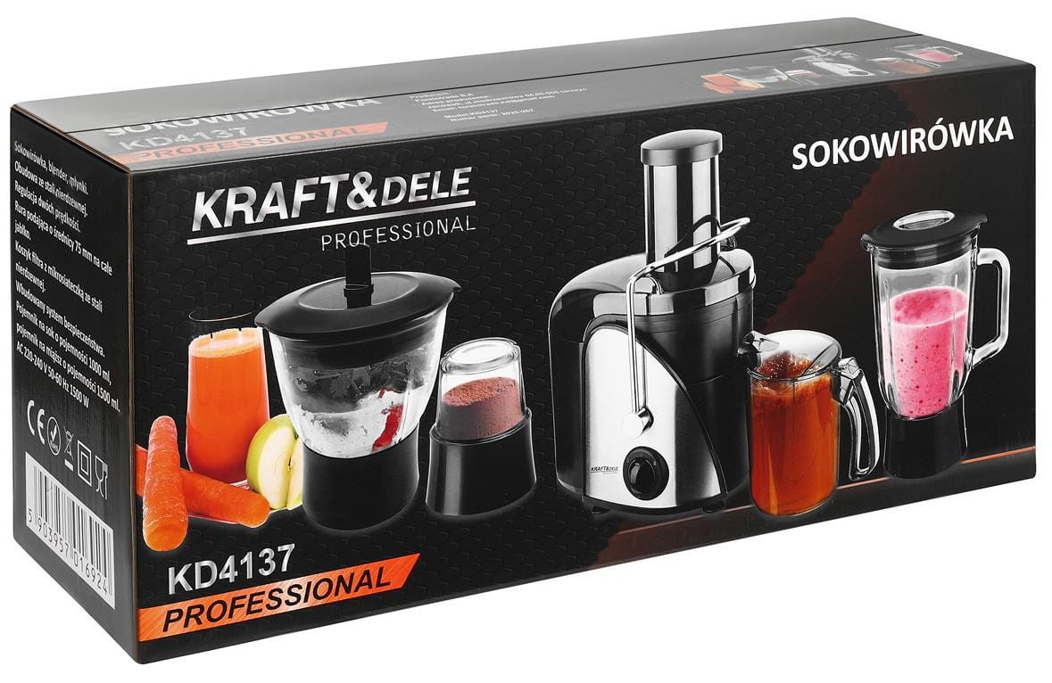 Storcător de fructe de 1500 W cu accesorii MODEL KD4137 Storcătorul multifuncțional KD4137, cu o putere de 1500W, este un aparat de bucătărie indispensabil pentru cei care apreciază alimentația sănătoasă, funcționalitatea și confortul. Nu numai că permite prepararea rapidă a sucurilor proaspete de fructe și legume, dar funcționează și ca blender și râșniță - ideal pentru sarcinile zilnice din bucătărie. Datorită setului său extins de accesorii, KD4137 vă permite să amestecați, să măcinați ingrediente uscate și condimente și să procesați cantități mai mari de ingrediente datorită capacității sale mari. Sistemul automat de curățare facilitează menținerea igienei dispozitivului, iar designul compact asigură depozitare convenabilă chiar și într-o bucătărie mică.