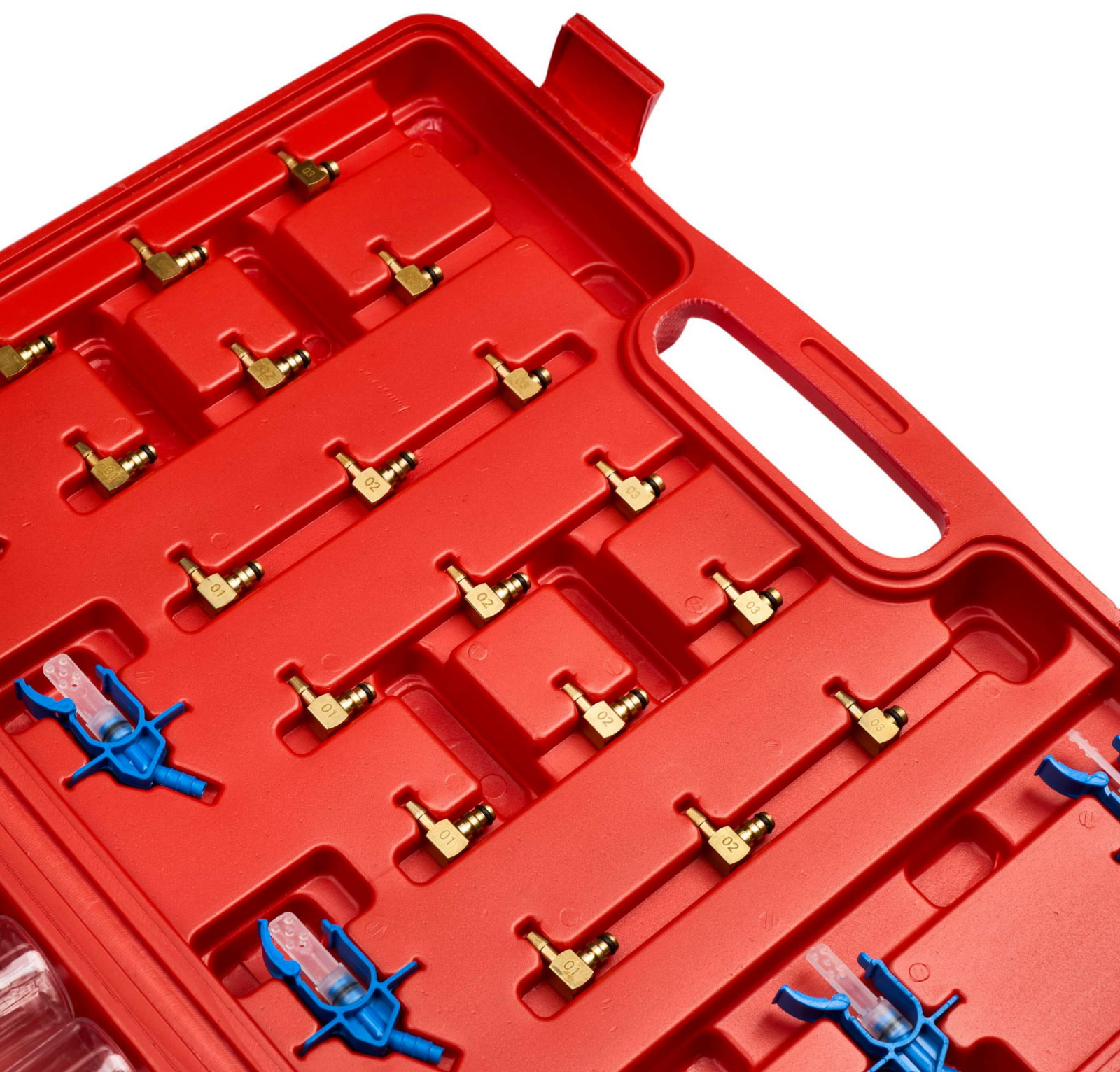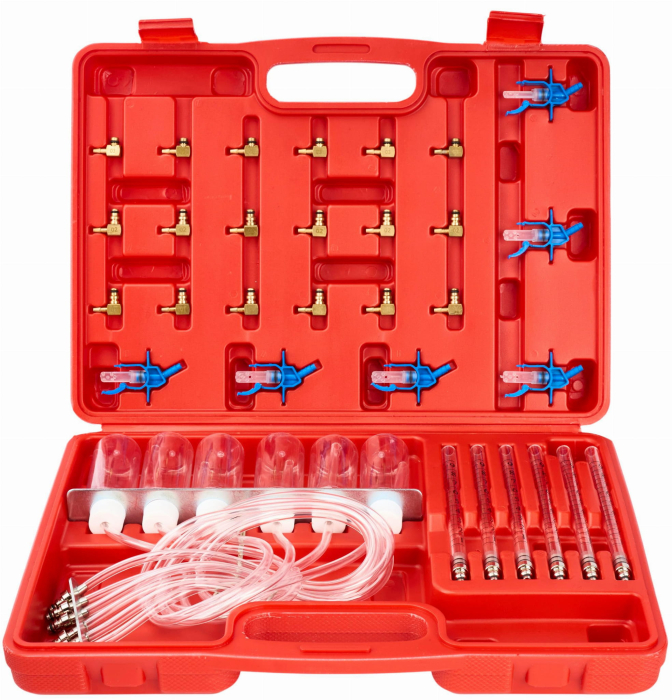 ✅ 6 cilindri de măsurare mari cu furtunuri și vârfuri pentru sistemul Bosch ✅ 6 buc. căni mici de măsurat pentru sistemul Bosch ✅ 6 conectori pentru sisteme Delphi ✅ 6 conectori pentru sistemele Denso ✅ 6 conectori pentru sisteme Siemens