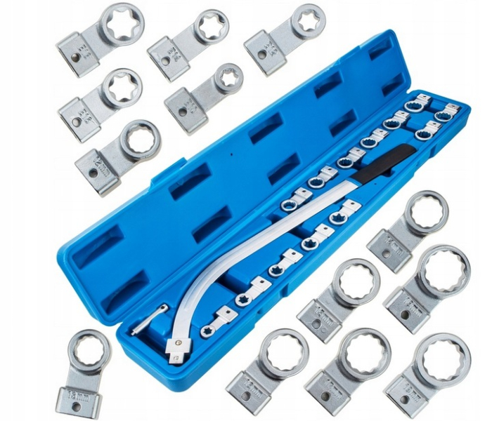 1x Braț lung pentru cheie cu mâner antiderapant. 8x chei tubulare cu 12 puncte (ochete): - 12 mm, 13 mm, 14 mm, 15 mm, 16 mm, 17 mm, 18 mm, 19 mm. 5x chei tubulare TORX E (profil E): - E10, E12, E14, E16, E18.