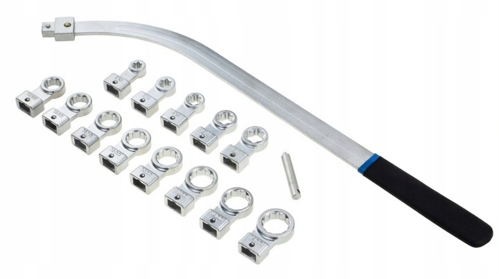Lungimea totală a brațului 470 mm Material: Oțel de scule ranforsat Număr de elemente din set : 14 (cheie + 13 tubulare) Tip cheie tubulară: cu 12 caneluri (canelate) și TORX-E Atașarea prizelor Pin dedicat
