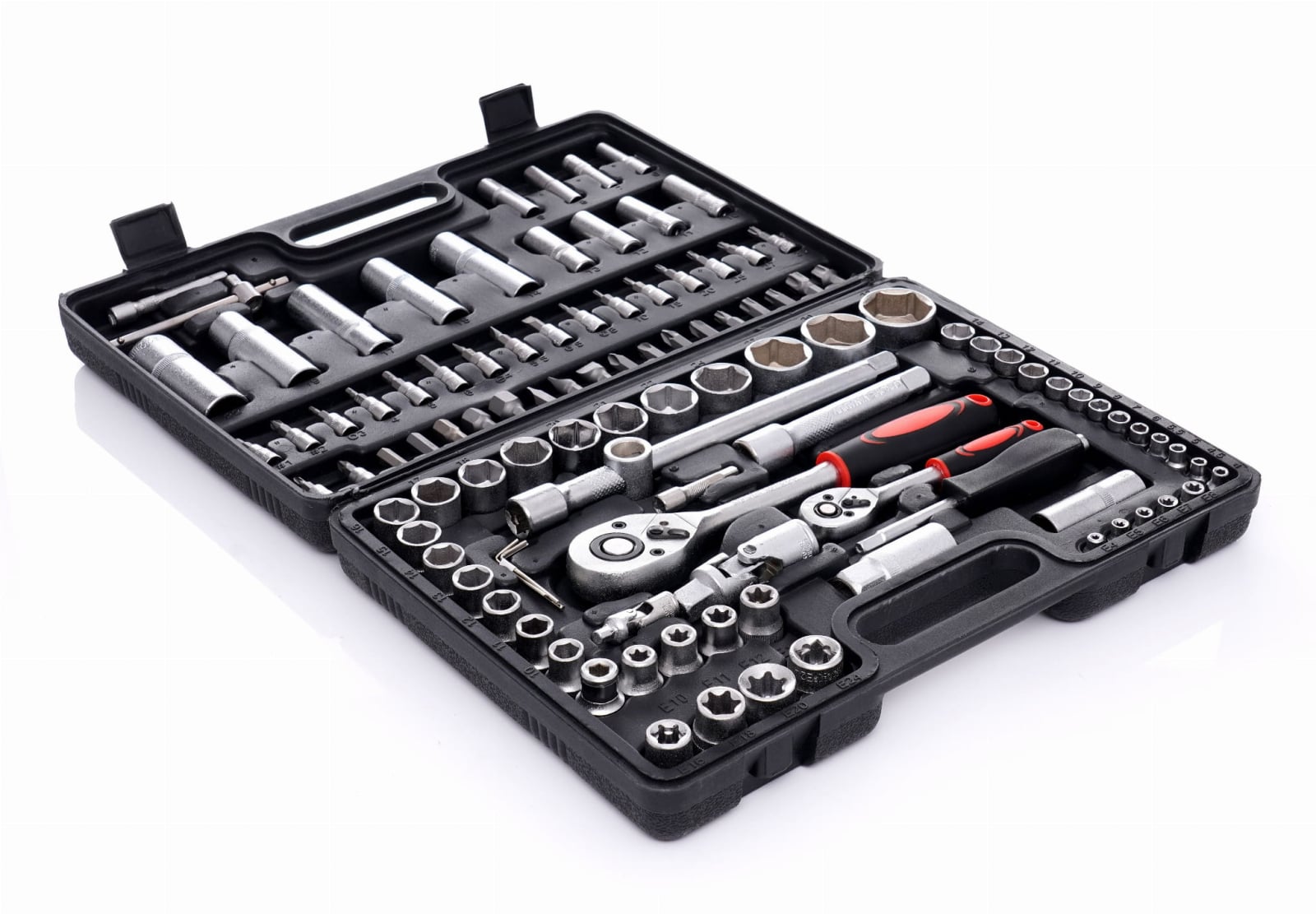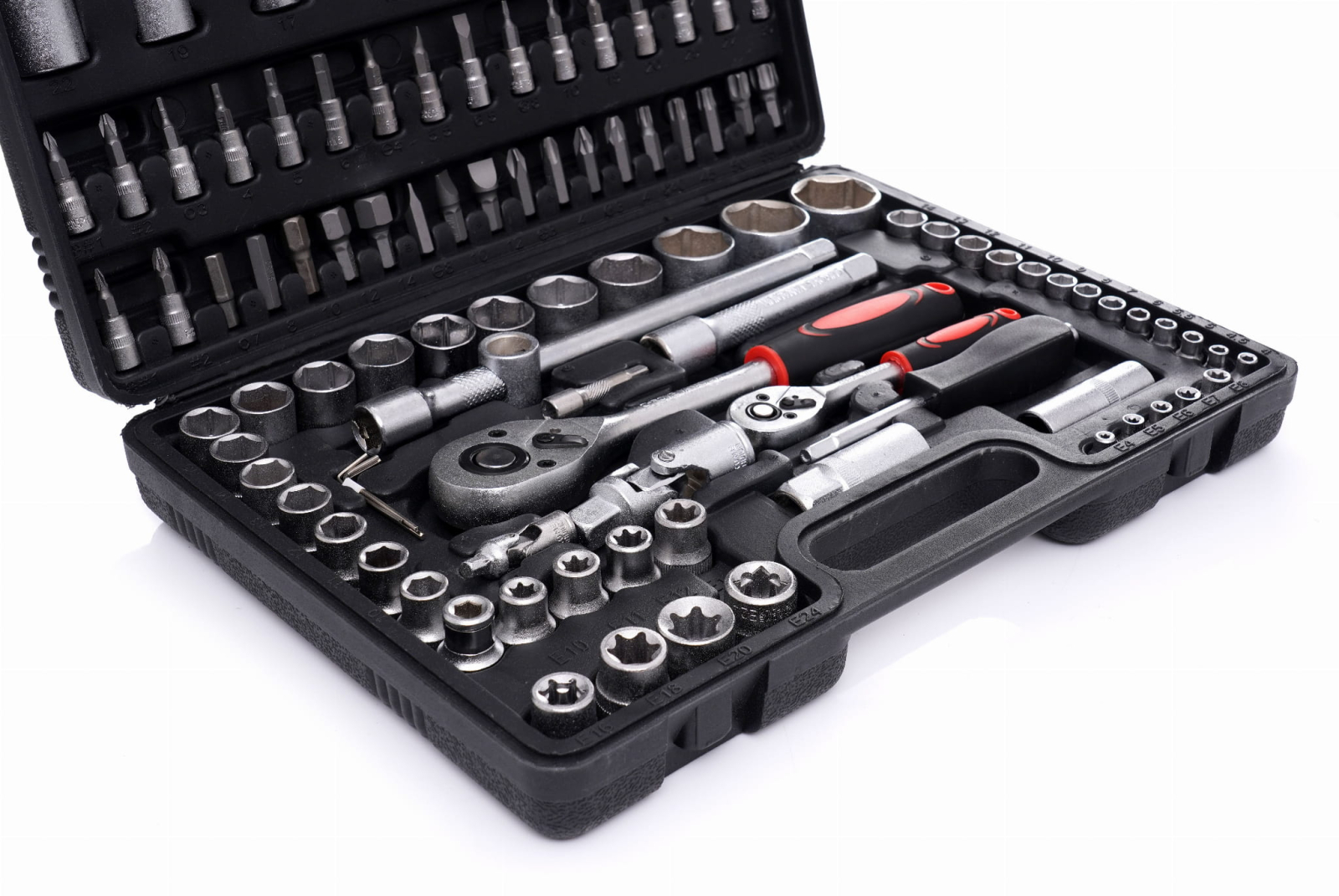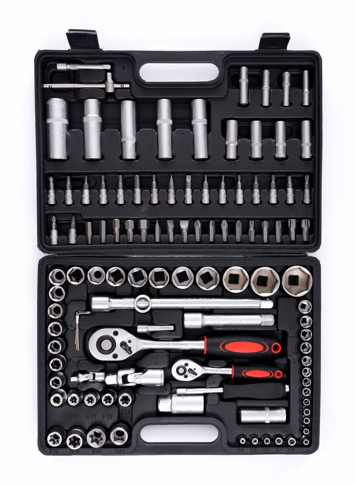Un set foarte extins de unelte, inclusiv chei tubulare și biți de șurubelniță.