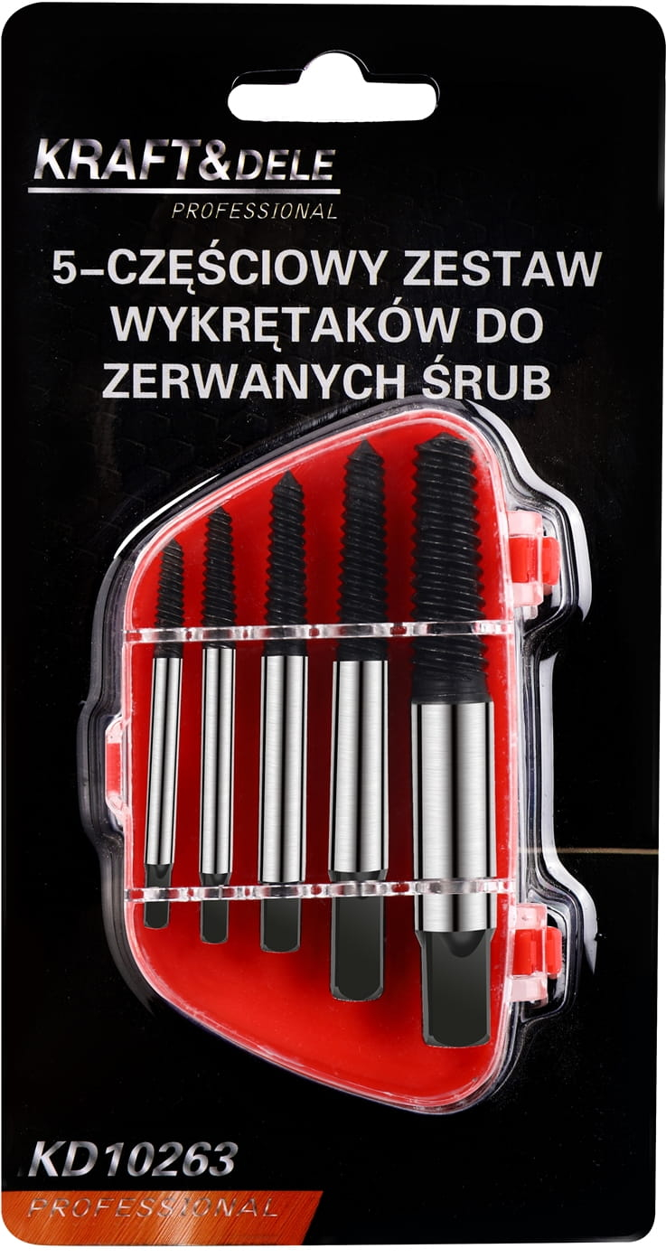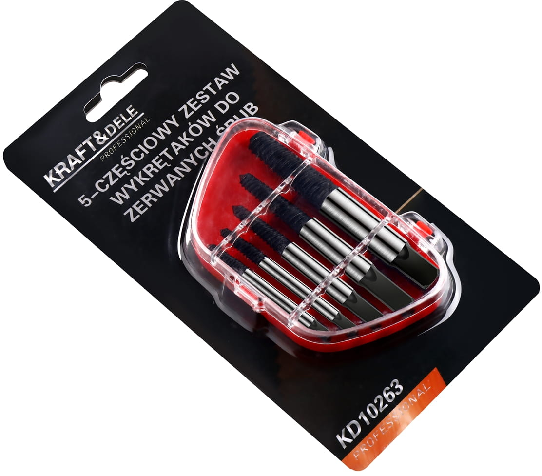 Un set profesional de extractoare de șuruburi pentru șuruburi rupte de la marca poloneză Kraft&Dele, număr de referință KD10263. Conceput pentru utilizatori casnici, din atelier și la locul de muncă. Dimensiuni extractor:
