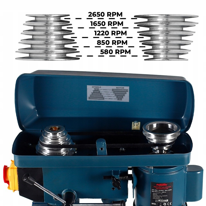 Controlul vitezei Burghiul cu masă coloană de 2200 W are capacitatea de a regla viteza prin schimbarea curelei de pe scripete