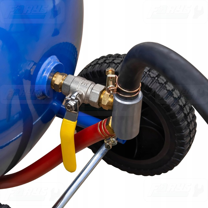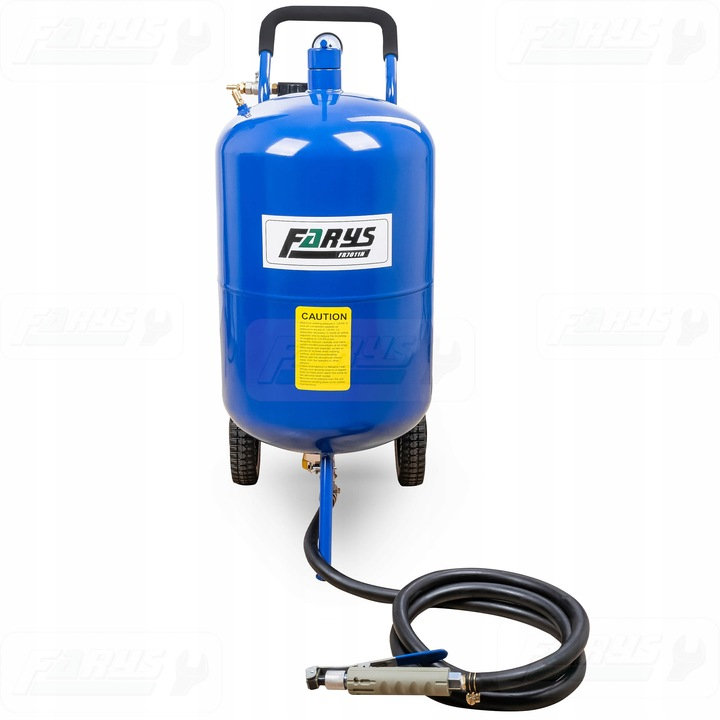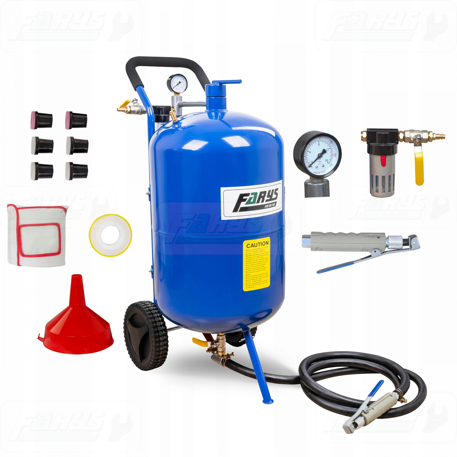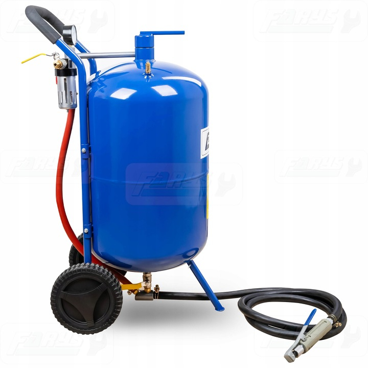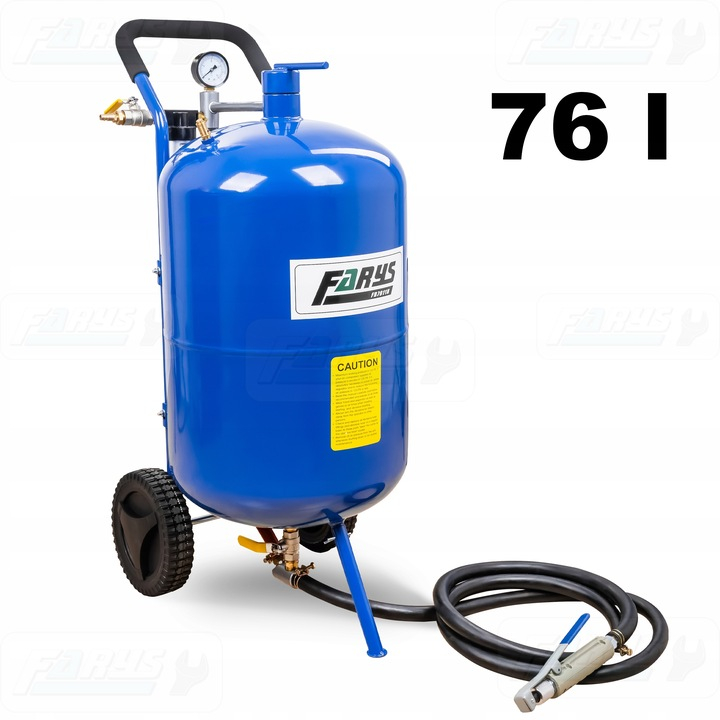 Aparat de sablat mobil  cu o capacitate de 76 de litri. Ideal pentru renovare și întreținere, lucrări în spații de depozitare. Echipat cu duze și pistoale de sablare, supapă de închidere, manometru, furtun de șlefuit, pâlnie pentru umplerea rezervorului și o mască de protecție cu lentilă din plexiglas.