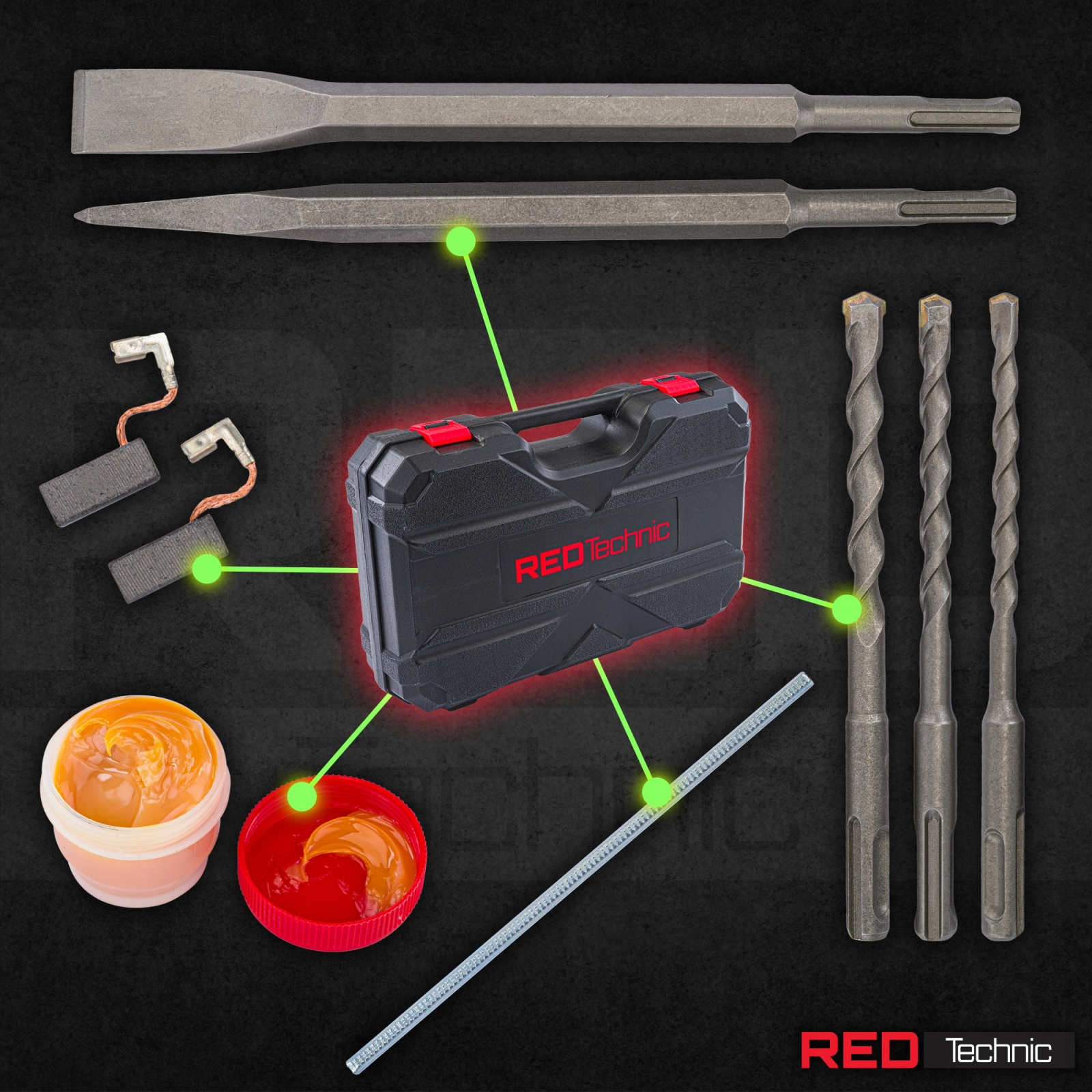 · Înfășurarea statorului de cupru: ciocanul rotopercutor Red Technic este echipat cu o înfășurare a statorului de cupru, ceea ce înseamnă nu numai performanțe mai mari, ci și o durată de viață mai lungă a sculei. Este o investiție în durabilitate și fiabilitate.