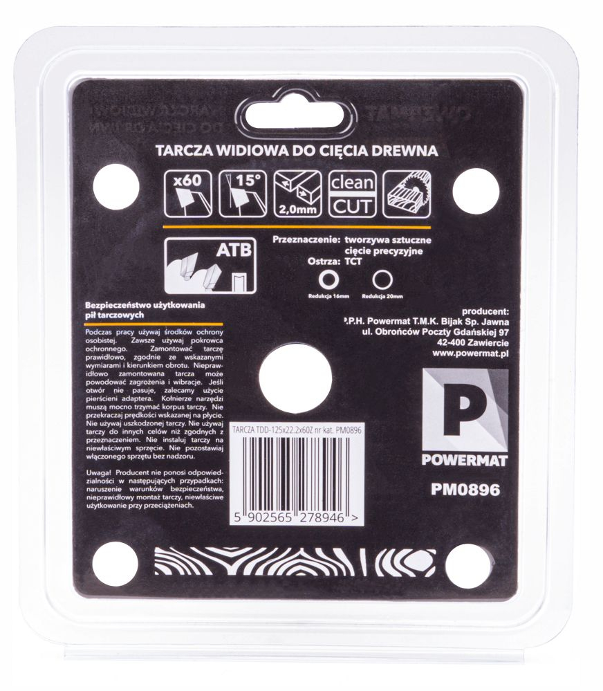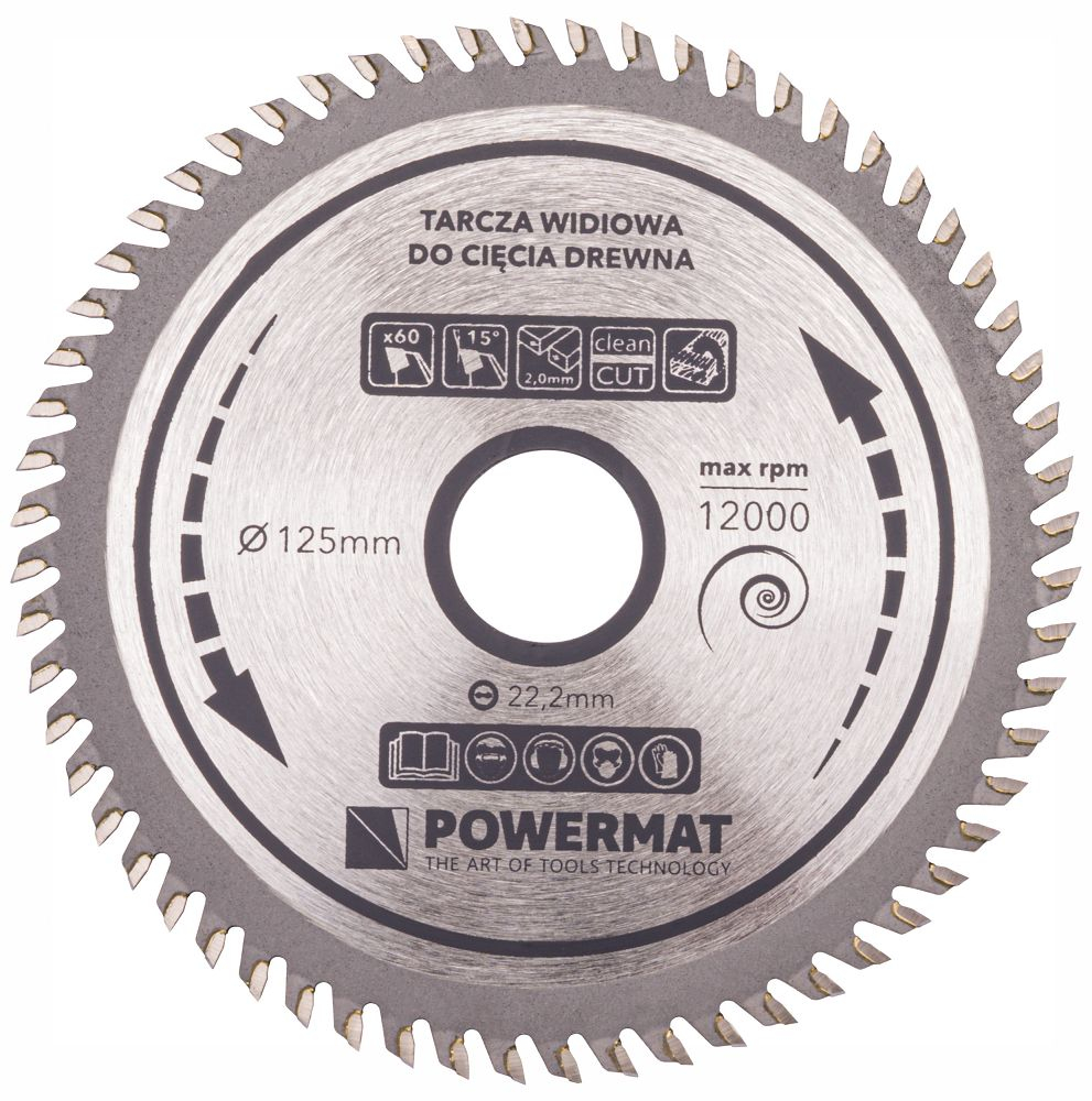 Lama durabilă din oțel călit conține 60 de dinți tăietori. Lamele sunt proiectate să funcționeze cu toate tipurile de ferăstraie universale staționare și portabile (inclusiv ferăstraie unghiulare). Lama POWERMAT este concepută pentru tăierea lemnului moale, a tuturor materialelor asemănătoare lemnului, inclusiv placaj, scânduri, scânduri, trunchiuri de copaci și crengi, precum și a materialelor moi. Este concepută pentru viteze de rotație foarte mari, asigurând tăierea rapidă și ușoară. Are o lamă standard pentru ferăstraie circulare și de tăiat în unghi. Diametrul exterior al lamei este de 125 mm. Gaura de montare este de 22,2 mm.