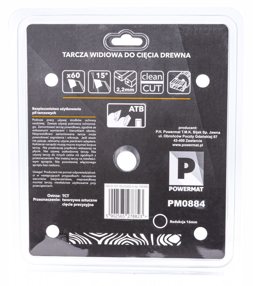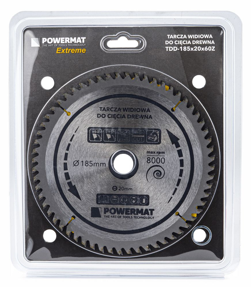 Lama durabilă din oțel călit conține 60 de dinți tăietori. Conceput pentru utilizare cu ferăstraie manuale, ferăstraie mici cu mitră și ferăstraie circulare. Lama POWERMAT este concepută pentru tăierea lemnului moale, a lemnului de esență tare și a tuturor materialelor asemănătoare lemnului, inclusiv placaj, scânduri, plăci și materiale moi. Este concepută pentru viteze de rotație foarte mari, asigurând tăierea rapidă și ușoară. Are o lamă standard pentru ferăstraie circulare și ferăstraie circulare. Diametrul exterior al lamei este de 185 mm. Gaura de montare este de 20 mm.