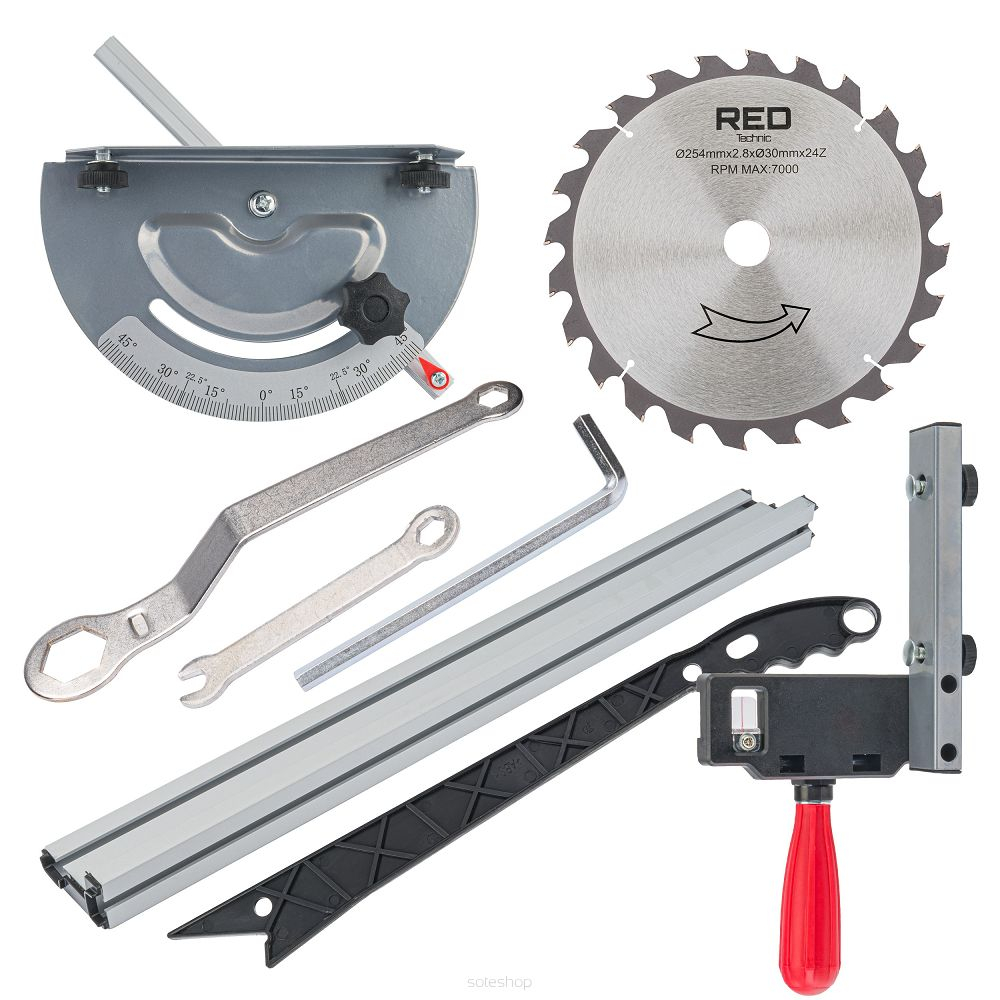 · Trei extensii de blat: Red Technic este echipat cu trei extensii de blat, ceea ce mărește funcționalitatea și ușurința în utilizare. Suprafețele mari de lucru facilitează lucrul cu bucăți mai mari de material și sporesc stabilitatea la tăiere.