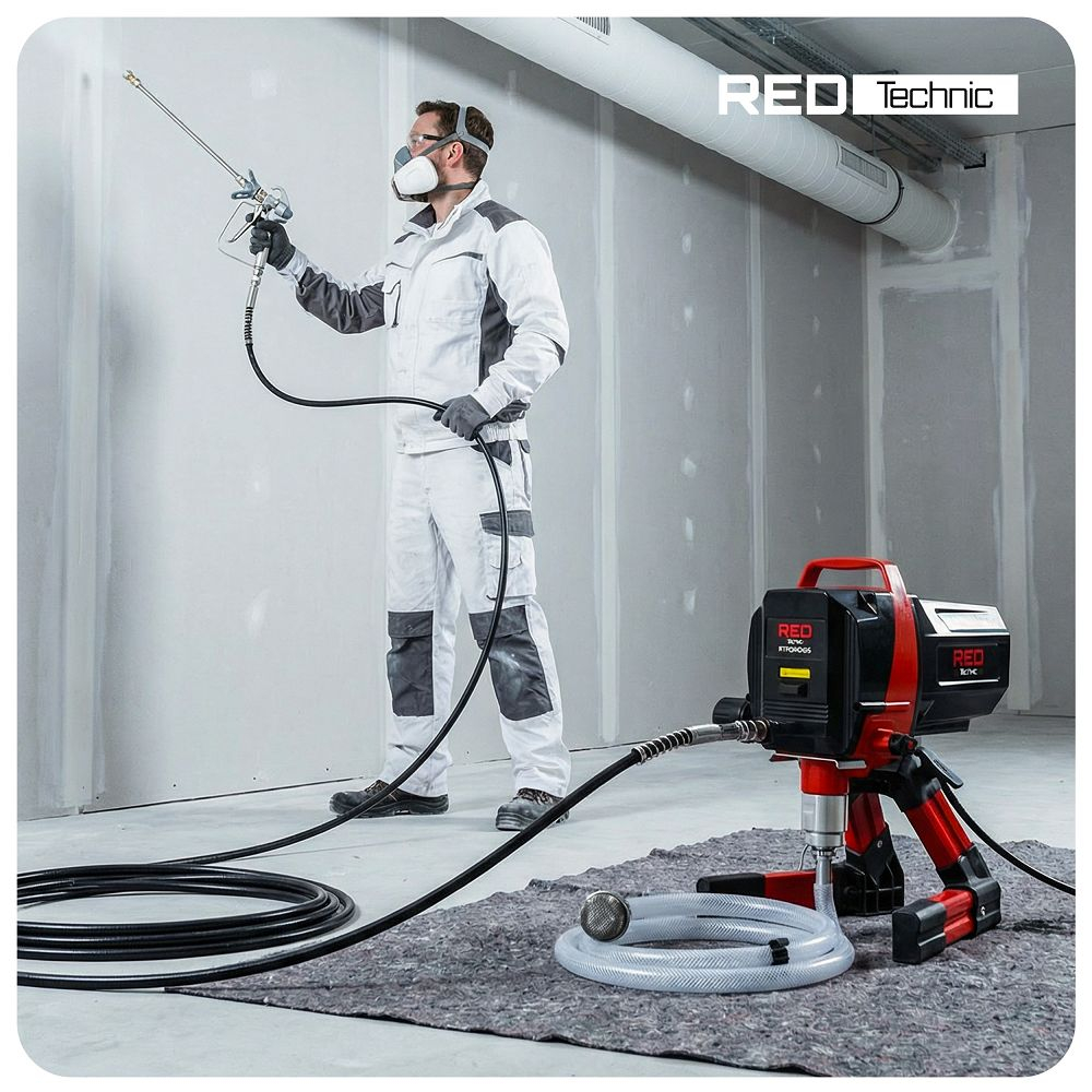 Tehnologia airless care funcționează la presiuni de până la 230 bari permite acoperirea uniformă a suprafețelor mari fără utilizarea aerului, rezultând un efect stabil și repetitiv. Datorită presiunii ridicate, vopseaua este complet descompusă și se obține o structură uniformă a stratului, fără dungi sau goluri. Sistemul vă permite să lucrați cu vopsele pe bază de apă, latex și vopsele pe bază de ulei selectate, astfel încât nu sunteți limitat la un singur tip de material. Reducerea risipei de materiale înseamnă un consum mai mic de vopsea și un control real al costurilor în cazul proiectelor mai mari.