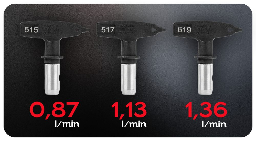 Setul include duzele 515, 517 și 619, datorită cărora puteți alege lățimea și tipul de pulverizare în funcție de tipul de vopsea și suprafață. Modelul 517 este potrivit pentru vopsele emulsie și latex, facilitând vopsirea pereților și a tavanelor. Diversele dimensiuni ale duzelor vă permit să lucrați atât pe suprafețe mai mari, cât și pe zone mai complexe. Câștigați flexibilitate fără a fi nevoie să achiziționați componente suplimentare pentru a începe.