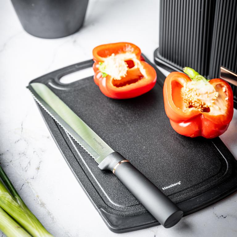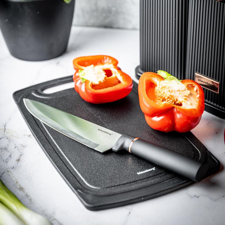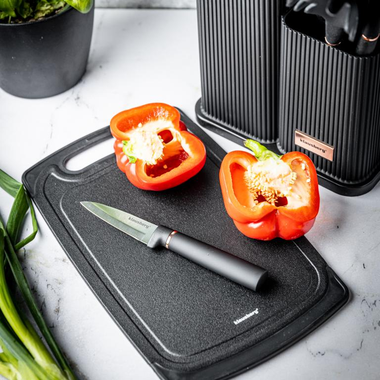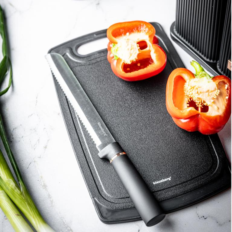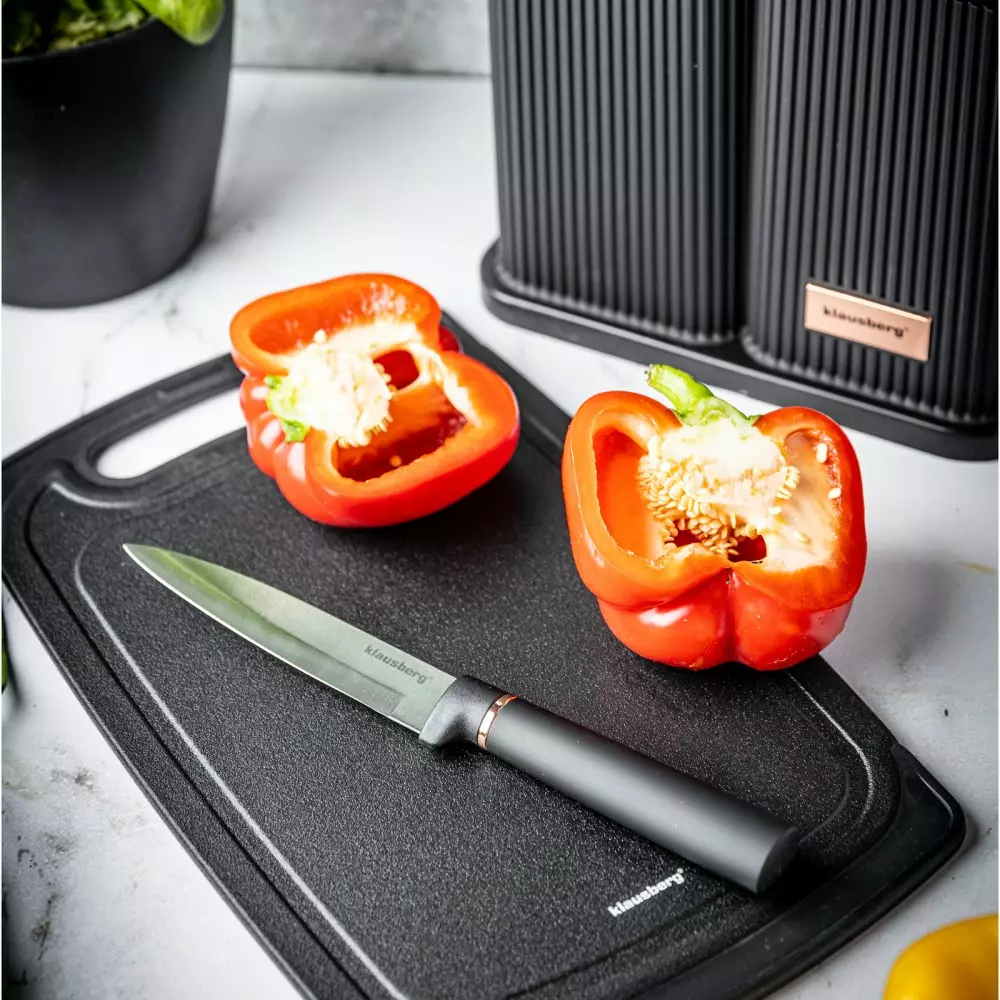 1) Set de 5 cuțite din oțel inoxidabil de înaltă calitate. 5 ustensile, linguri; tocător din material de înaltă calitate și sigur, într-un suport de depozitare.