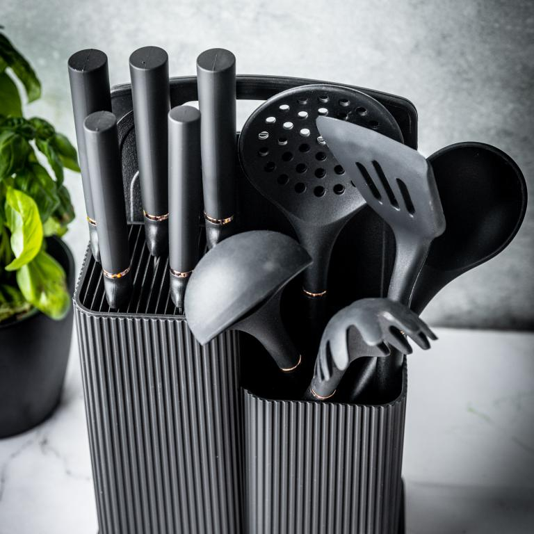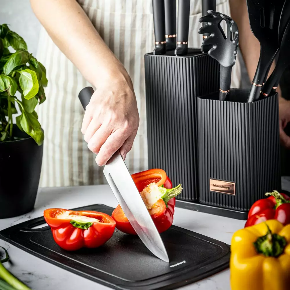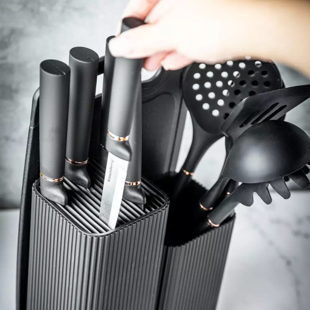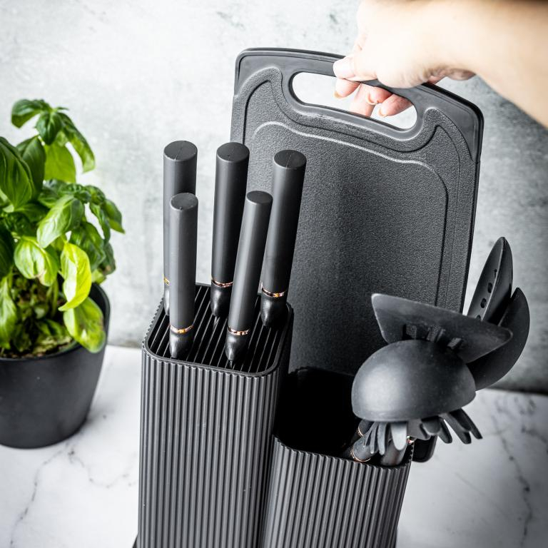 Set 12 piese, 5 cutite otel, 5 ustensile silicon, tocator si suport depozitare (KB-7835)