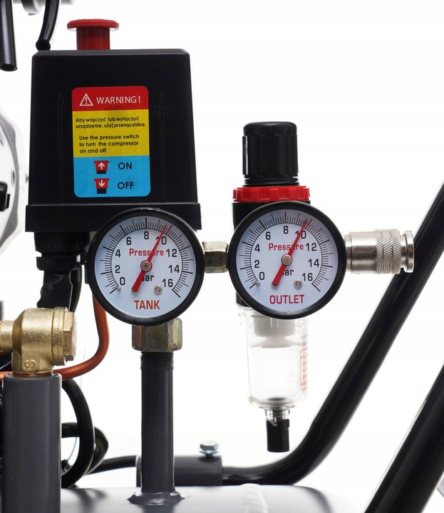 Compresorul este echipat cu două manometre clare. Una dintre ele este combinată