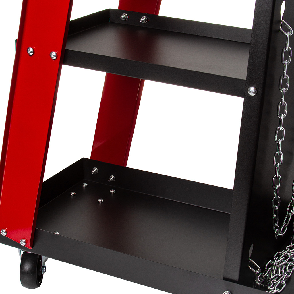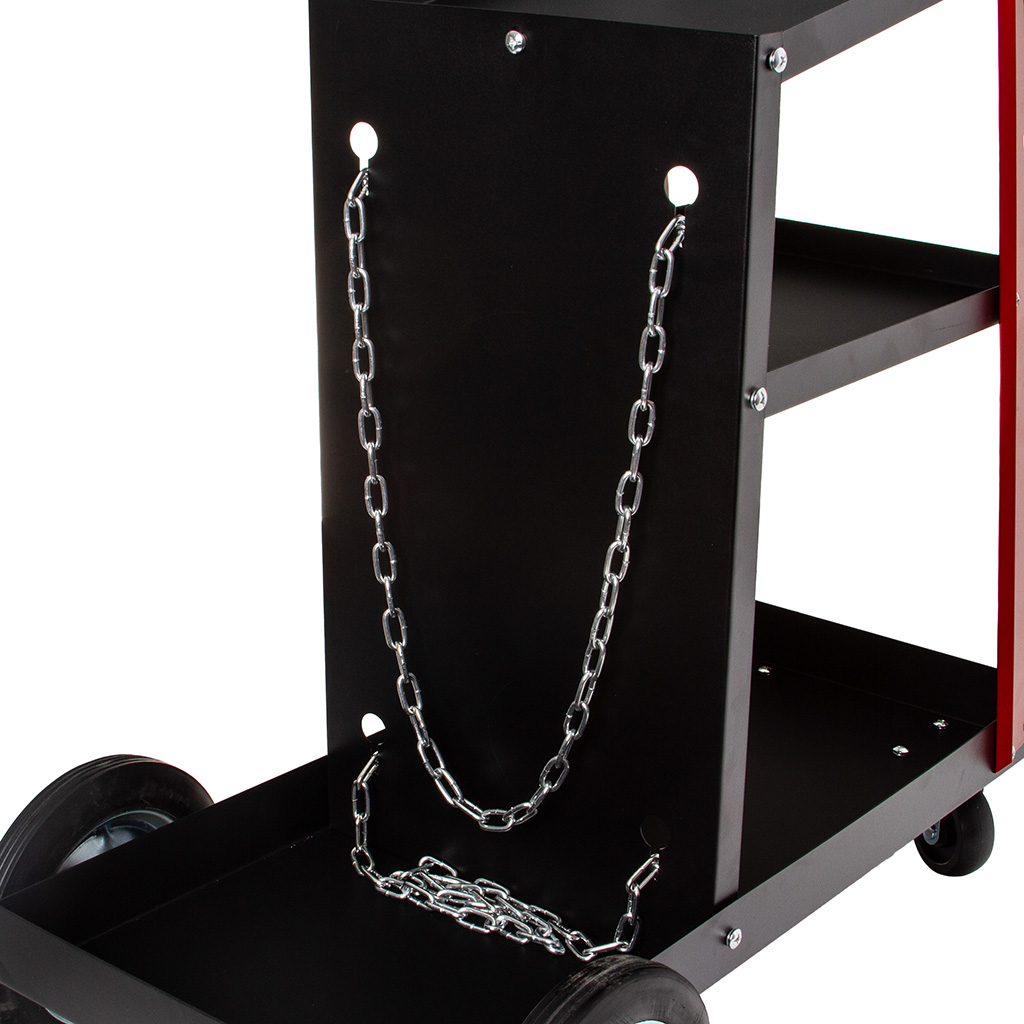 Raftul superior este conceput pentru un aparat de sudură, în timp ce celelalte două oferă spațiu amplu de depozitare pentru accesorii. În spatele căruciorului se află un raft pentru butelii de gaz.