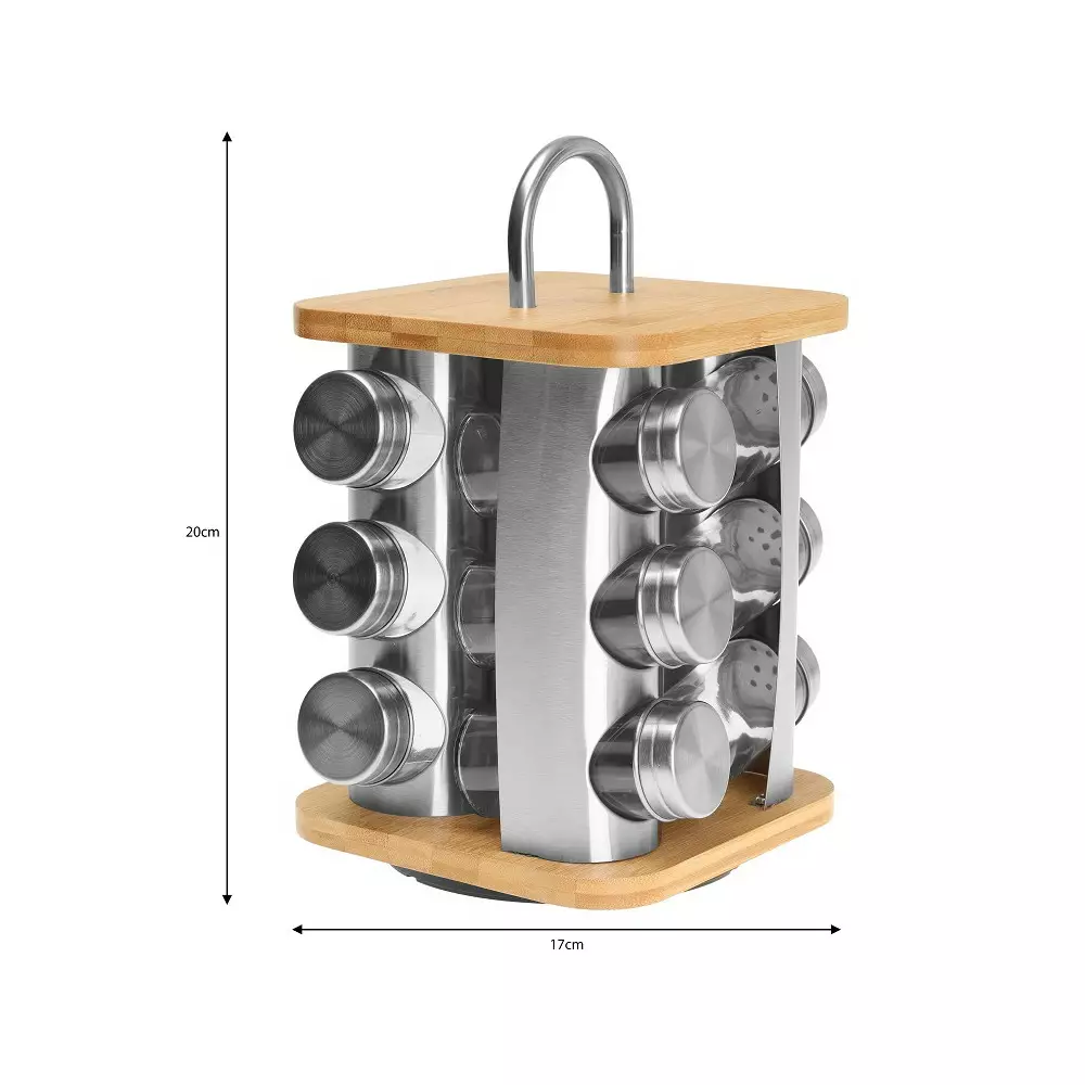 Un set de 16 recipiente de sticlă pe un suport rotativ din bambus, fabricat din oțel. Recipientele sunt fabricate din sticlă groasă și închise cu un capac de oțel. Sub capac se află un dop cu găuri pentru stropire. Suportul se rotește la 360 de grade pe o bază pivotantă.
