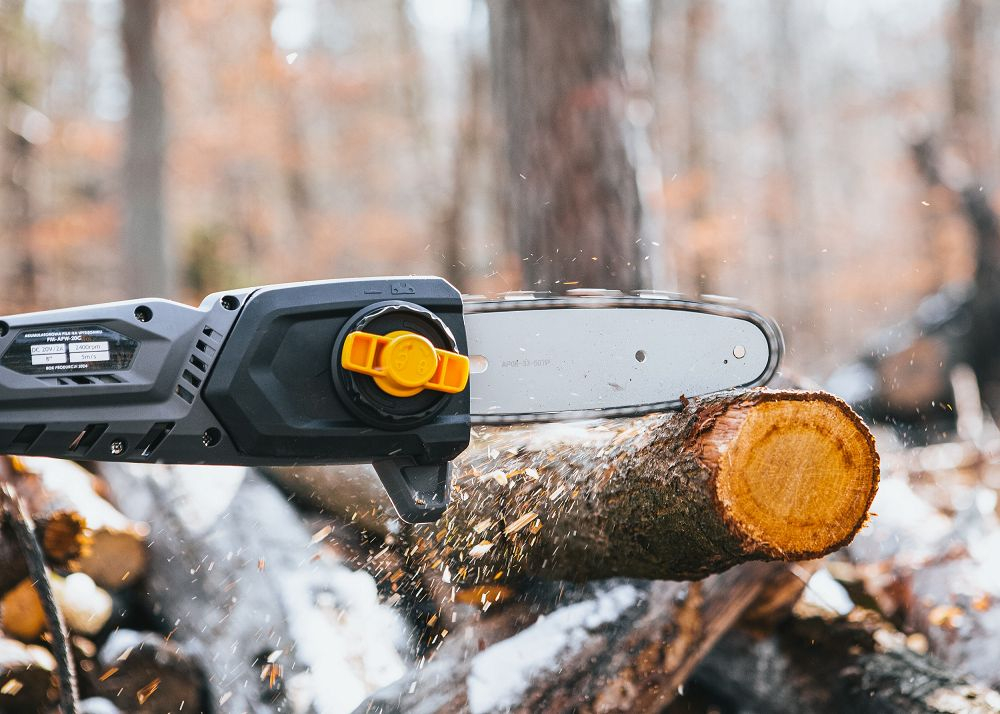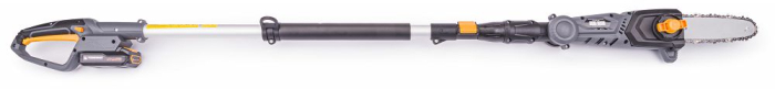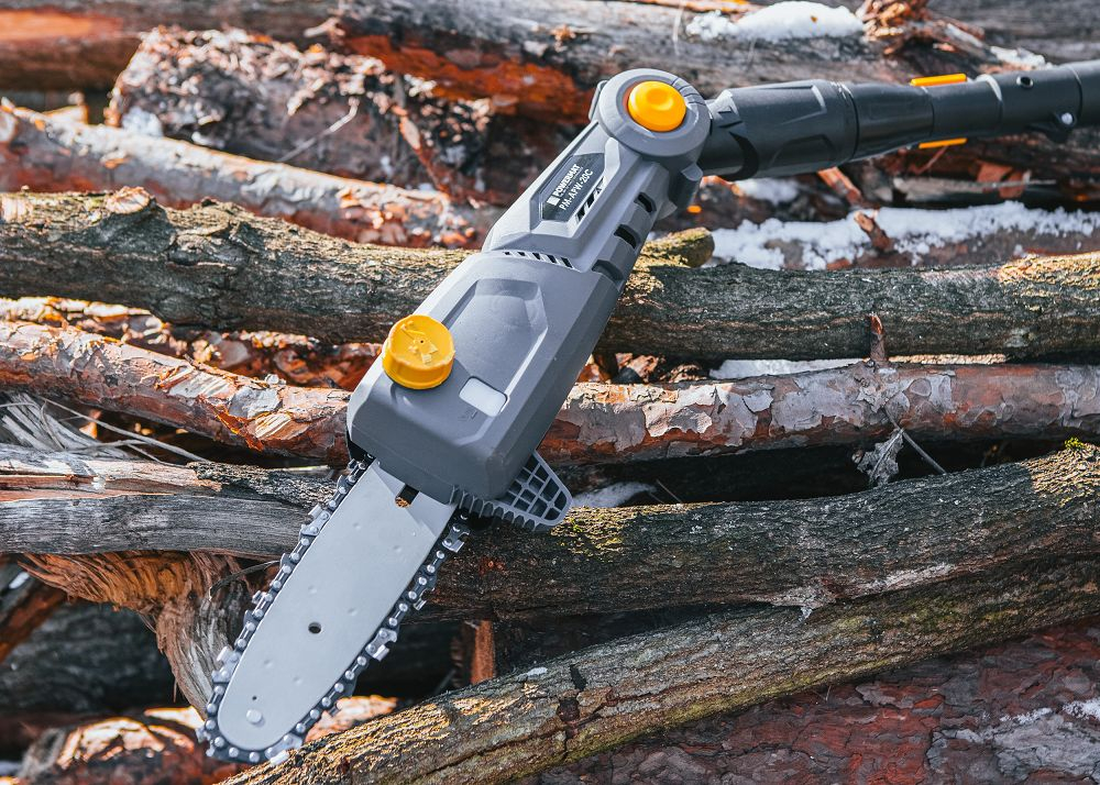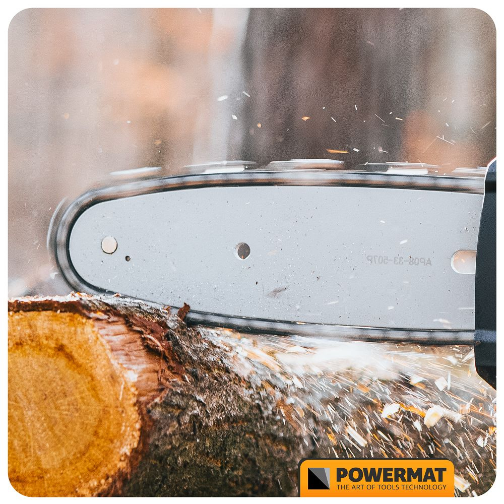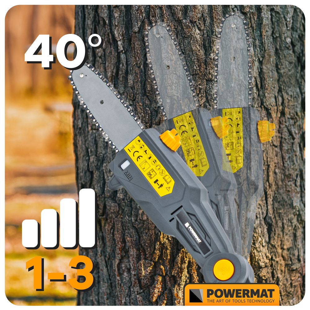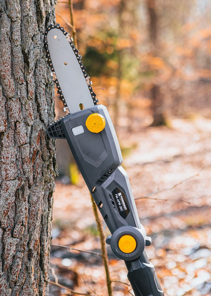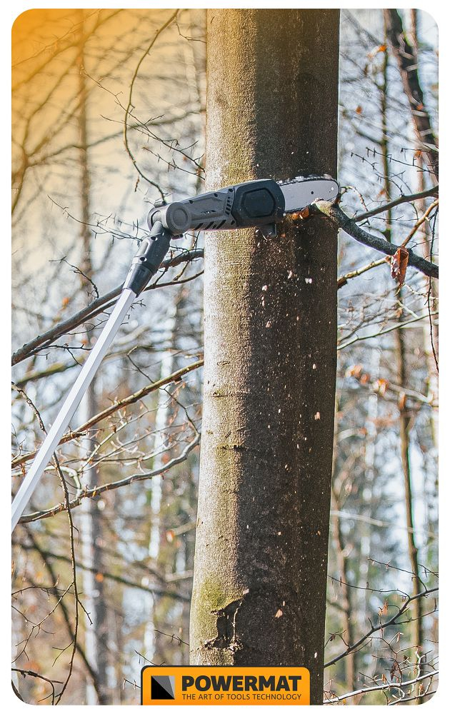Fierăstrăul electric cu tijă POWERMAT PM-APW-20C cu reglare a înclinării în patru poziții este dotat cu o bară de ghidare și un lanț de înaltă calitate. Reglarea rapidă și ușoară a lungimii tijei de la 172 cm la 240 cm și reglarea în patru poziții a unghiului capului de tăiere fac tăierea copacilor mult mai ușoară. Motorul electric, alimentat de o baterie de 20V - 2Ah, permite tăierea crengilor groase datorită rezervei sale de putere. Lungimea șinei de ghidare este de 20 cm, iar lungimea de lucru este de 18 cm. Fierăstrăul este fabricat din materiale de înaltă calitate, asigurând o bună stabilitate și, în consecință, o oboseală redusă în timpul funcționării. Fierăstrăul este dotat cu un sistem automat de lubrifiere a lanțului. Nivelul uleiului poate fi verificat cu ușurință prin intermediul unui indicator transparent. Un avantaj major al ferăstrăului este greutatea sa de doar 3,25 kg . Viteza lanțului este de 5 m/s.
