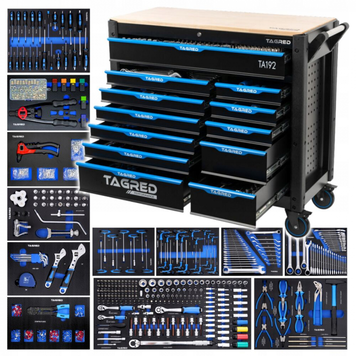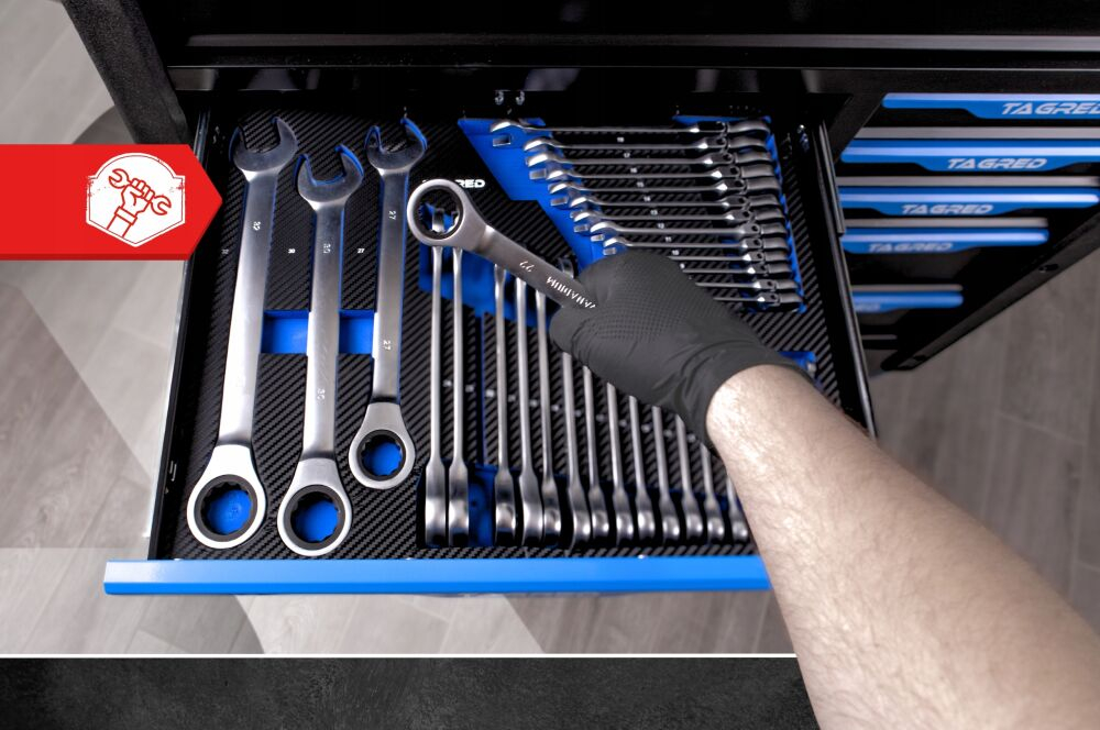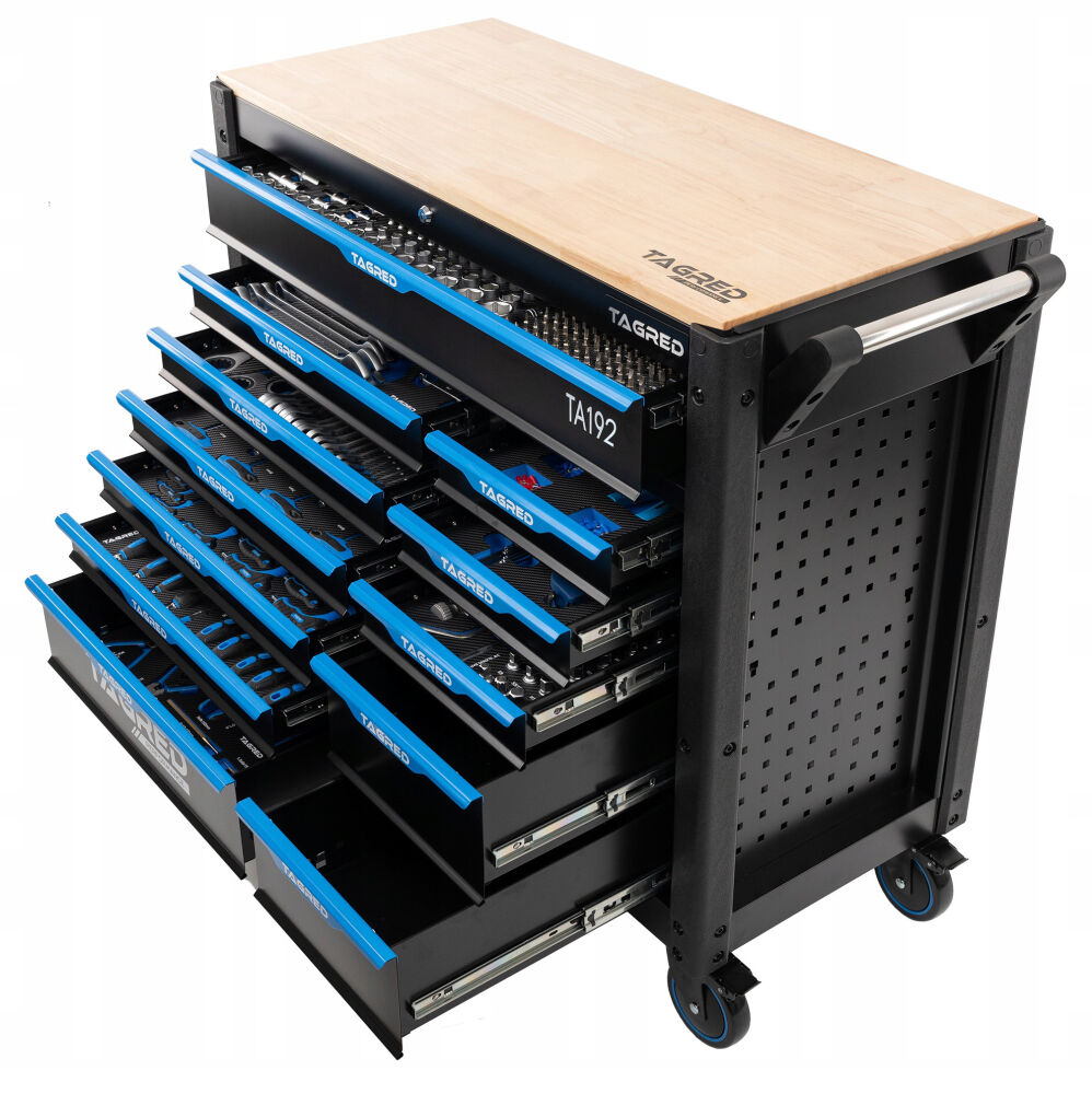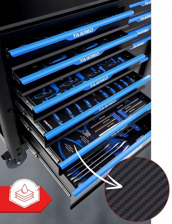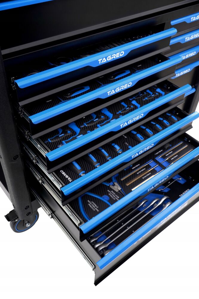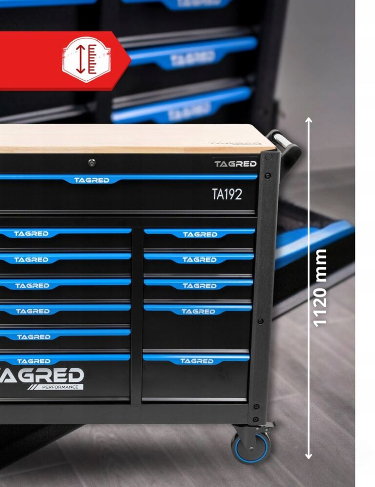 Calitate excelentă, manoperă solidă Dulapurile noastre de scule sunt rezultatul combinării materialelor de cea mai înaltă calitate cu o manoperă perfectă. Fabricate din oțel laminat la rece cu grosimea de 0,8 mm, dulapurile noastre sunt incredibil de rezistente! Asta e fiabilitate pe care te poți baza! Complet echipat, poți face față oricărei provocări Căruciorul de atelier Tagred este echipat cu un set complementar de scule de înaltă calitate, care vor satisface nevoile chiar și ale celui mai exigent utilizator. Echiparea bogată a dulapului TAGRED vă va permite să vă personalizați setul de scule în funcție de nevoile celor mai exigente provocări din atelier. Soluții inovatoare pentru confortul dumneavoastră Roțile mari și directive cu blocare automată și frână, mânerul durabil și confortabil asigură deplasarea ușoară a căruciorului chiar și pe suprafețe neuniforme, iar ghidajele cu rulmenți ranforsați și mecanismul de glisare cu bilă facilitează munca de zi cu zi. Funcționalitate ridicată, fiabilitate ani de zile În plus, pereții laterali ai dulapului Tagred, realizați din oțel perforat, permit instalarea de umerașe sau mânere suplimentare, în timp ce căptușeala sertarelor din EVA rezistentă la ulei oferă protecție și durabilitate suplimentare. Toate acestea pentru satisfacția și confortul dumneavoastră deplin în munca de zi cu zi. Date tehnice