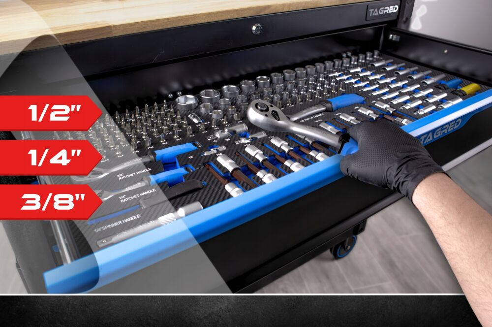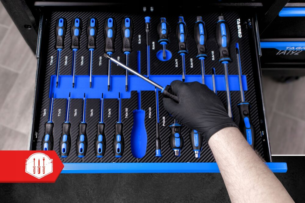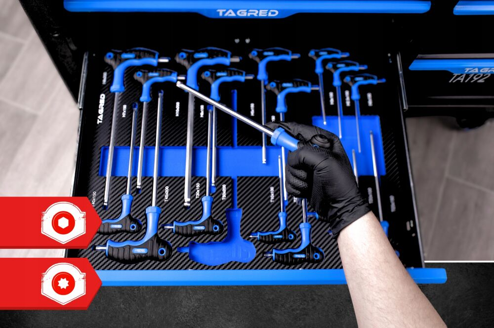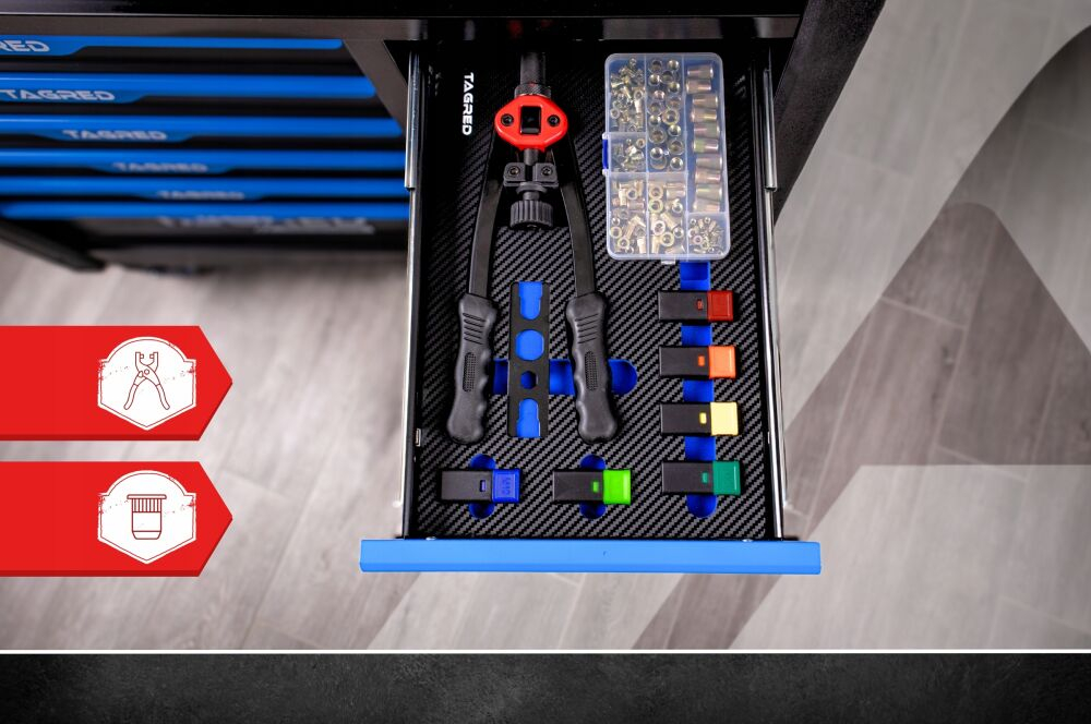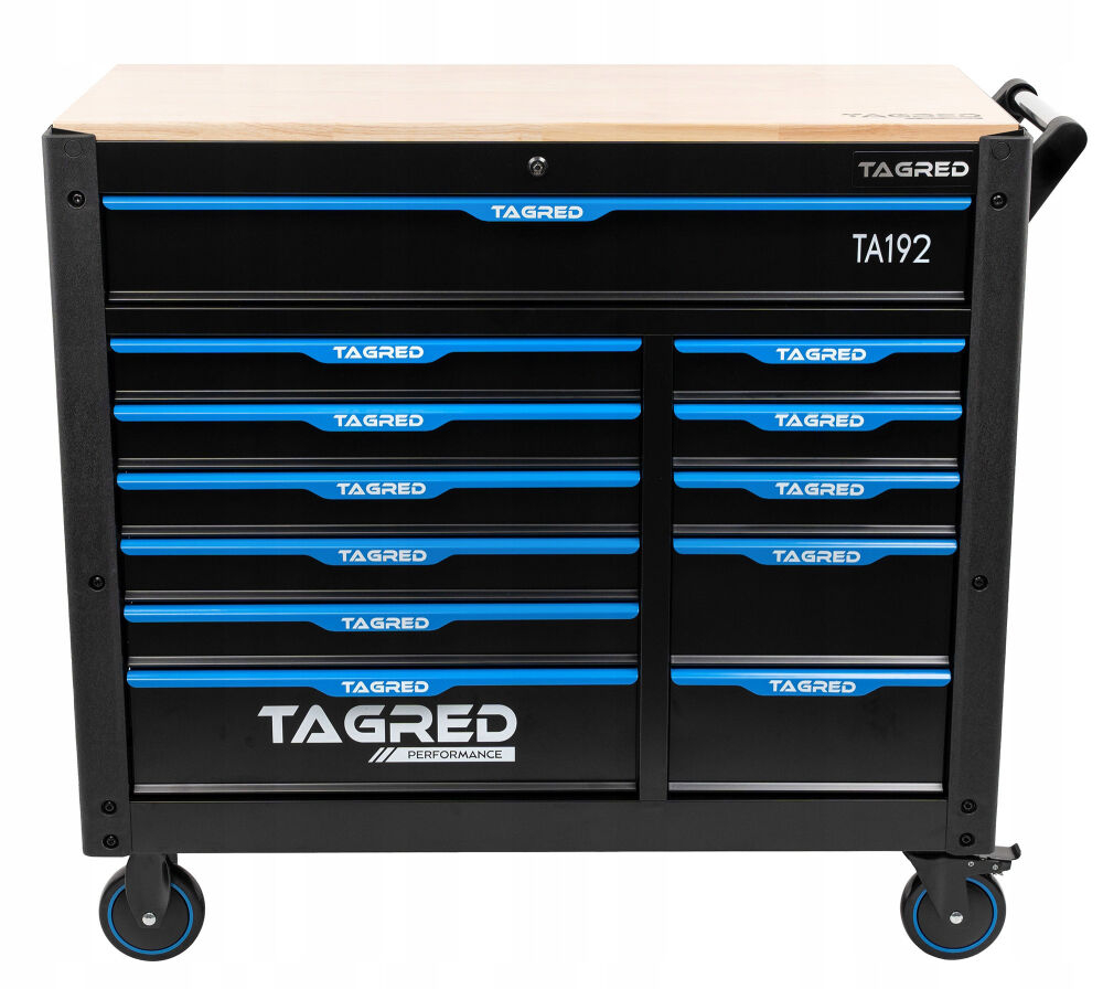 Calitate excelentă, manoperă solidă Dulapurile noastre de scule sunt rezultatul combinării materialelor de cea mai înaltă calitate cu o manoperă perfectă. Fabricate din oțel laminat la rece cu grosimea de 0,8 mm, dulapurile noastre sunt incredibil de rezistente! Asta e fiabilitate pe care te poți baza! Complet echipat, poți face față oricărei provocări Căruciorul de atelier Tagred este echipat cu un set complementar de scule de înaltă calitate, care vor satisface nevoile chiar și ale celui mai exigent utilizator. Echiparea bogată a dulapului TAGRED vă va permite să vă personalizați setul de scule în funcție de nevoile celor mai exigente provocări din atelier. Soluții inovatoare pentru confortul dumneavoastră Roțile mari și directive cu blocare automată și frână, mânerul durabil și confortabil asigură deplasarea ușoară a căruciorului chiar și pe suprafețe neuniforme, iar ghidajele cu rulmenți ranforsați și mecanismul de glisare cu bilă facilitează munca de zi cu zi. Funcționalitate ridicată, fiabilitate ani de zile În plus, pereții laterali ai dulapului Tagred, realizați din oțel perforat, permit instalarea de umerașe sau mânere suplimentare, în timp ce căptușeala sertarelor din EVA rezistentă la ulei oferă protecție și durabilitate suplimentare. Toate acestea pentru satisfacția și confortul dumneavoastră deplin în munca de zi cu zi. Date tehnice