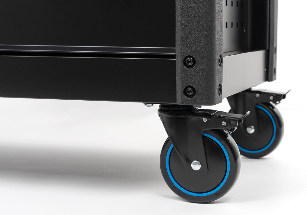 Roțile mari directoare, blocarea automată și frâna asigură siguranța în timpul deplasării dulapului chiar și pe pante mici.