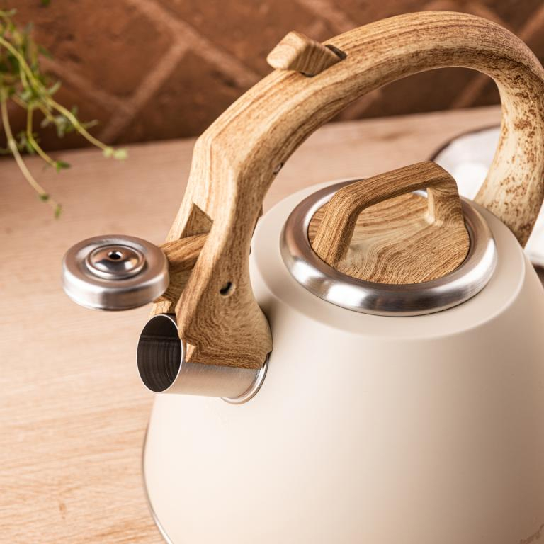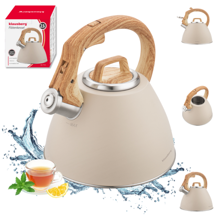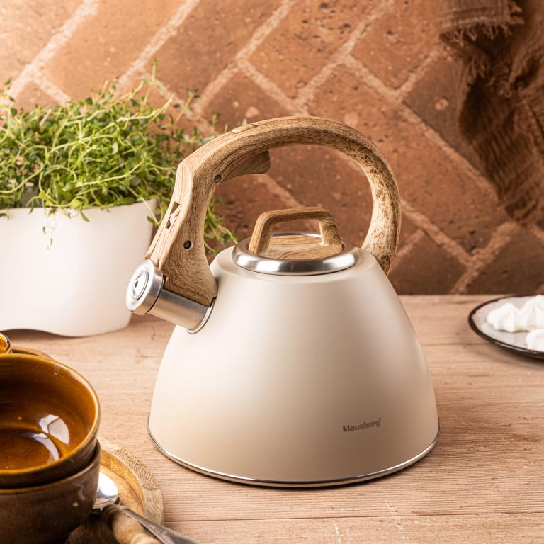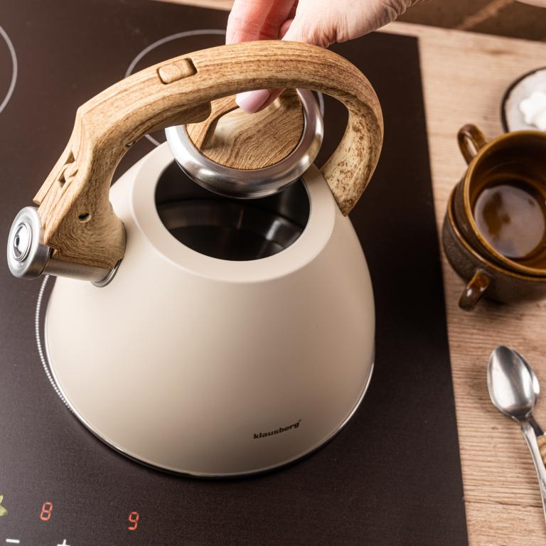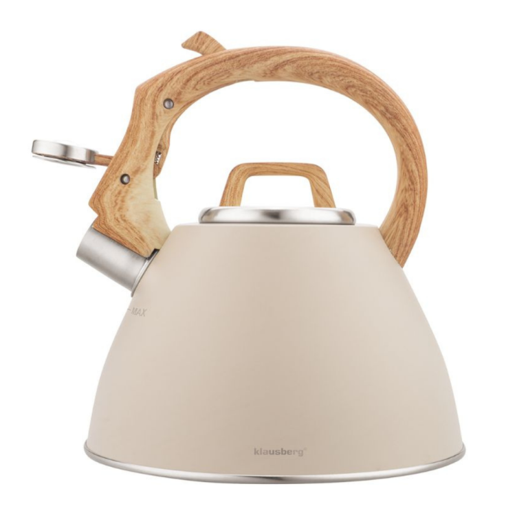 Klausberg KB-7954 este un fierbător elegant, cu un finisaj bej mat și un mâner care imită lemnul natural. Acesta combină designul decorativ cu o funcționalitate ridicată, fiind perfect potrivit atât pentru interioarele moderne, cât și pentru cele rustice. Fabricat din oțel inoxidabil, este prevăzut cu un mâner moale la atingere, un fluier și un mecanism de deschidere cu buton, asigurând o utilizare zilnică confortabilă și sigură.