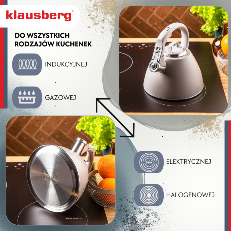 Klausberg KB-7953 este un fierbător elegant, fabricat din oțel inoxidabil, cu un finisaj mat bej latte. Combină funcționalitatea, durabilitatea și un design atractiv, fiind perfect atât pentru bucătăriile luminoase, cât și pentru cele întunecate. Echipat cu fluier, mâner moale la atingere, deschidere sigură cu buton și fund pentru capsule, asigură ușurință în utilizare și compatibilitate cu toate plitele.