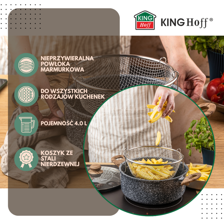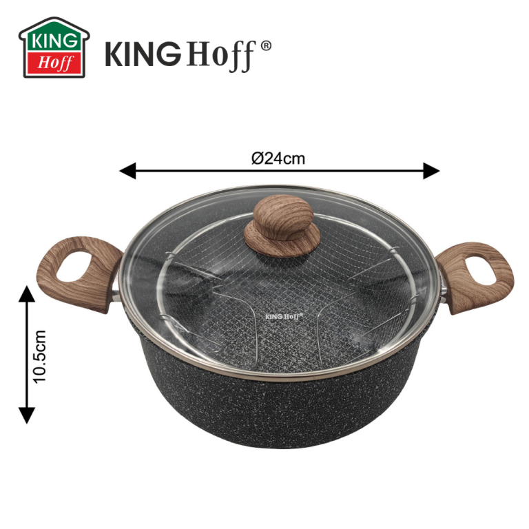 KingHoff KH-1985 este o oală versatilă de 4 litri care vă permite să prăjiți, să fierbeți, să fierbeți la foc mic și să scurgeți alimentele într-o singură oală. Cu un coș din oțel inoxidabil, un capac de sticlă ventilat și un strat antiaderent marmorat, este perfectă pentru cartofi prăjiți, tempura, carne, tăiței și preparate asiatice. Este o soluție practică și elegantă atât pentru gătitul acasă, cât și pentru catering.