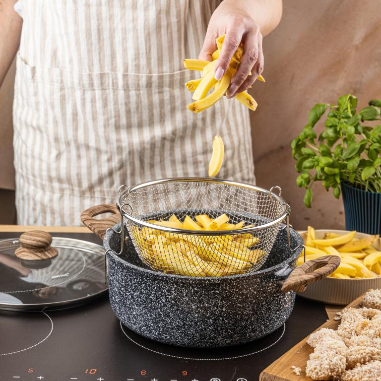 Oala pentru cartofi prajiti 24 cm 4 l cu invelis marmorat cos inox si capac (KH-1985)