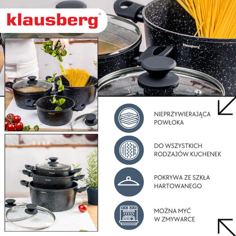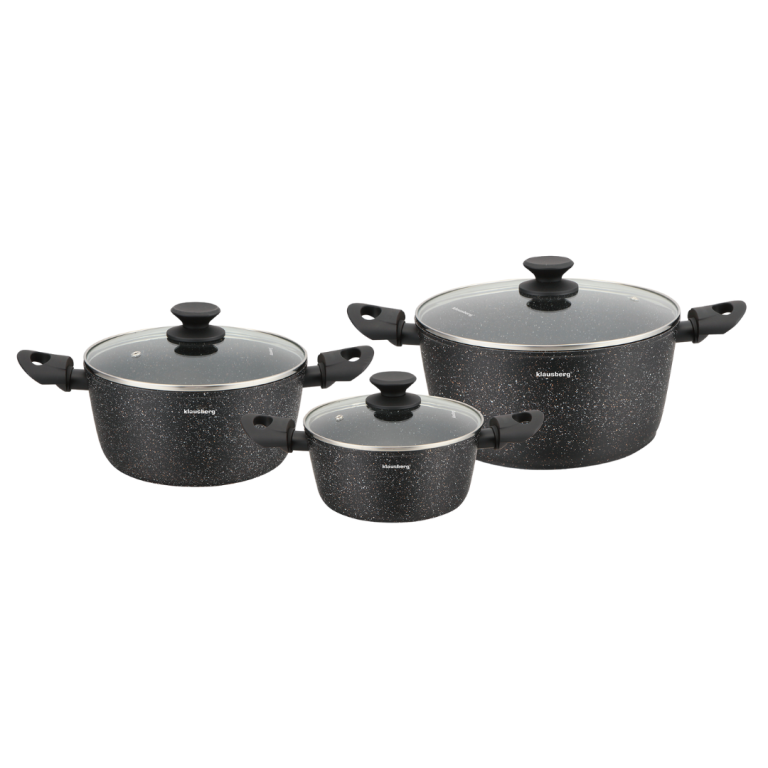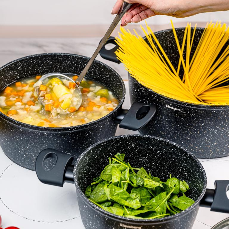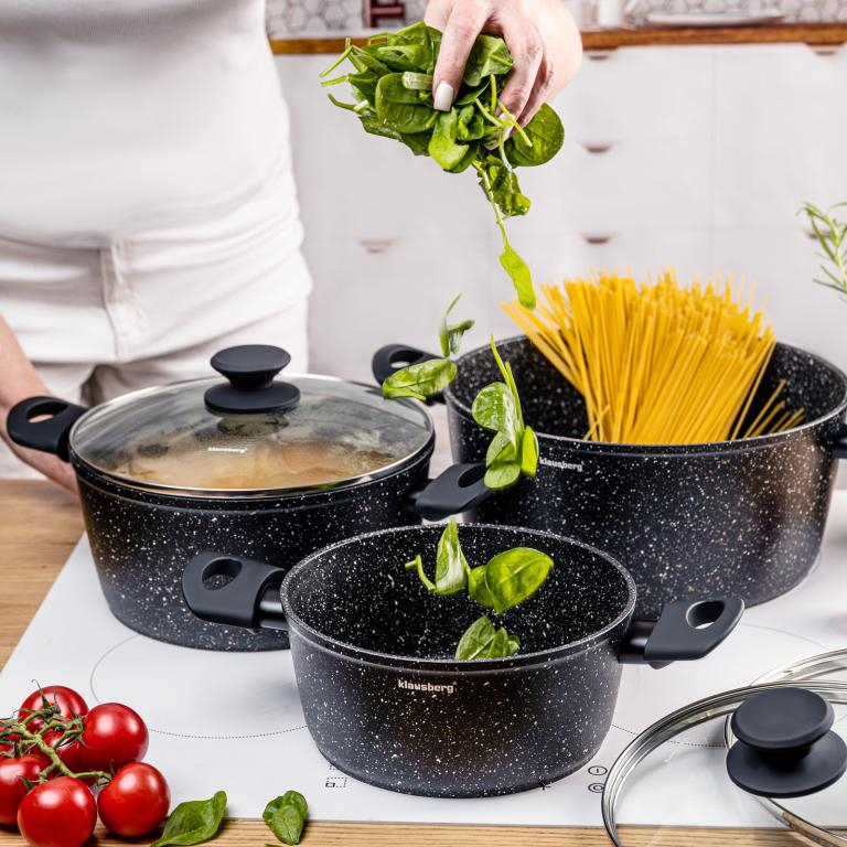 Klausberg KB-7960 este un set modern și elegant de trei oale, cu înveliș antiaderent din marmură, conceput pentru gătitul zilnic confortabil. Fiecare oală are un interior antiaderent extrem de durabil, rezistent la zgârieturi și căldură, ceea ce face ca alimentele să fie antiaderente și curățate rapid și fără probleme. Schema elegantă de culori negre cu pete strălucitoare face ca setul să arate grozav în orice bucătărie - modernă, clasică și chiar profesională.
