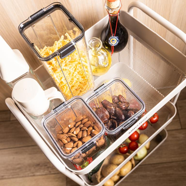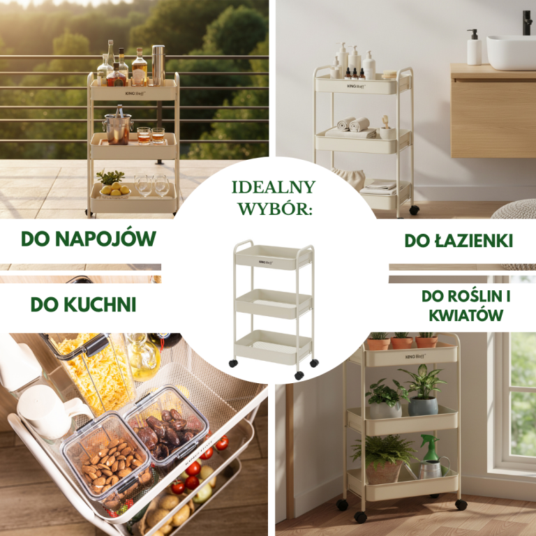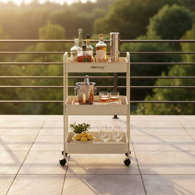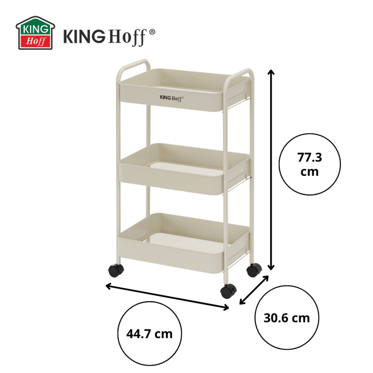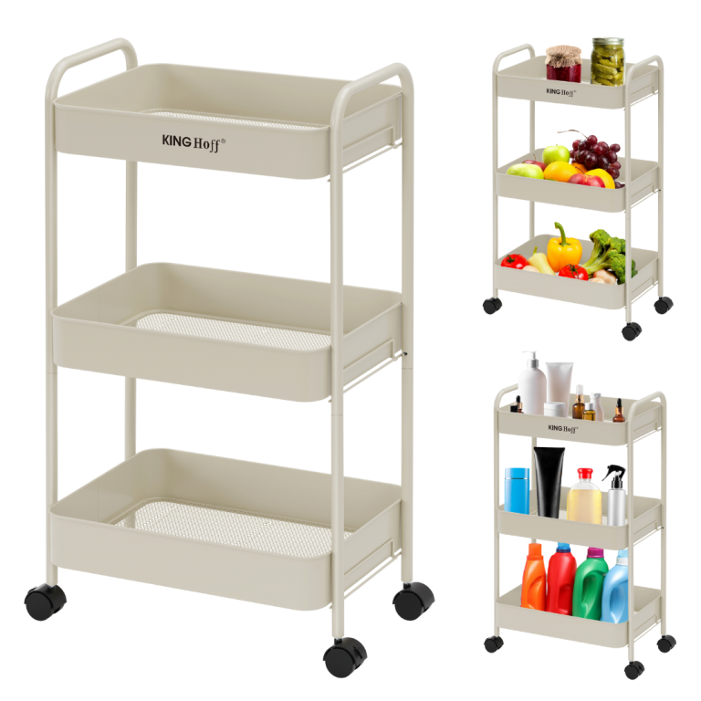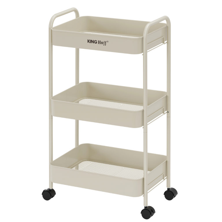 Practică și elegantă - biblioteca mobilă cu trei niveluri KINGHoff , în culoarea bej, este o soluție elegantă pentru organizarea spațiului în bucătărie, baie, living sau birou. Nuanța subtilă și caldă de bej se îmbină perfect cu o varietate de designuri interioare, adăugând confort și atractivitate estetică. Biblioteca a fost concepută având în vedere confortul de zi cu zi. Echipată cu roți pivotante la 360° și o funcție de blocare, asigură o mișcare ușoară și o poziționare stabilă. Trei rafturi încăpătoare oferă suficient spațiu pentru băuturi, articole de toaletă, accesorii de bucătărie, plante sau prosoape, ceea ce o face o piesă de mobilier extrem de versatilă. Caracteristici ale produsului: